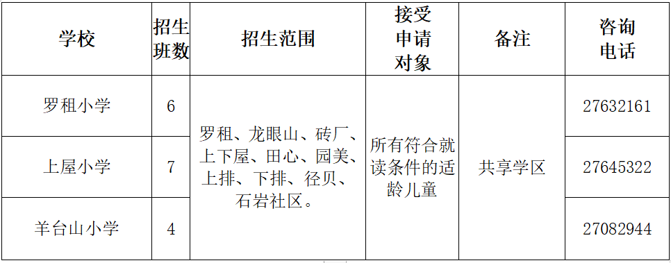 (上屋小学、罗租小学、羊台山小学三所学校属于共享学区,这三所学校范围内的学生可报这三个志愿学校)