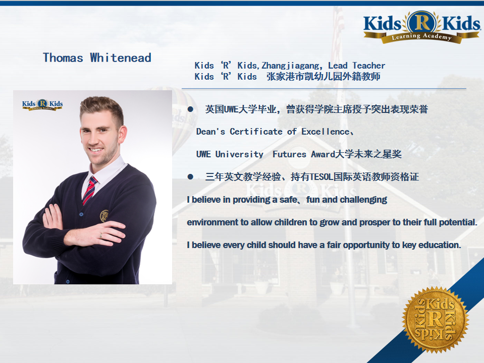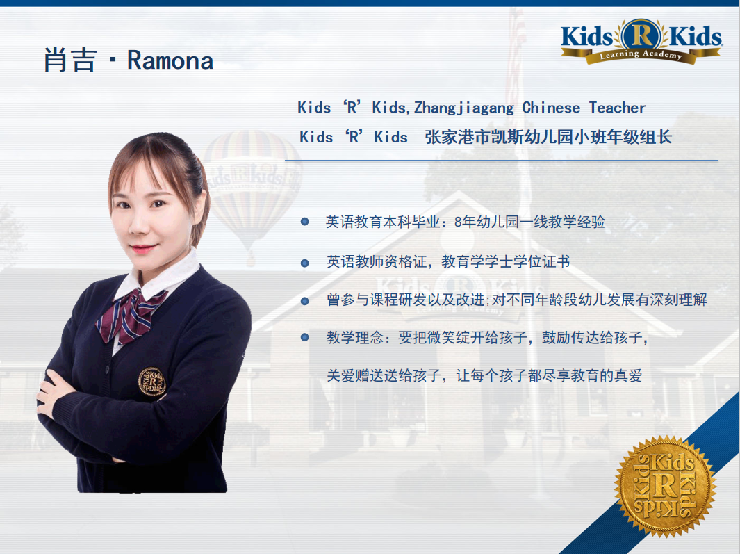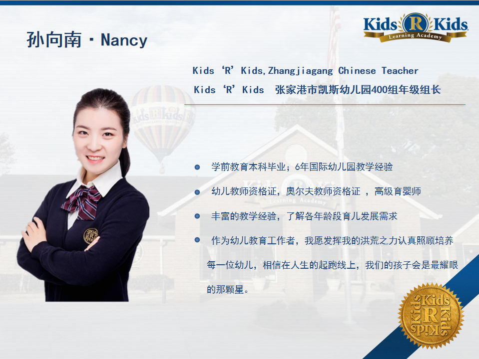1961年,Kids‘R’Kids的创始人Pat Vinson and Janice Vinson夫妇开创了他们的幼儿教育事业,时至今日,Kids‘R’Kids已发展成全美国最知名的幼儿教育品牌,并在美国拥有160多所高品质幼儿园。Kids‘R’Kids也是美国第一家获得幼儿教育领域权威认证AdvancED认证的幼儿教育机构。2014年,Kids‘R’Kids正式登陆中国,致力于与新一代中国家庭携手,让半个多世纪的专业沉淀与华夏文化玩美融合,绽放爱与智慧,收获成长的美妙!