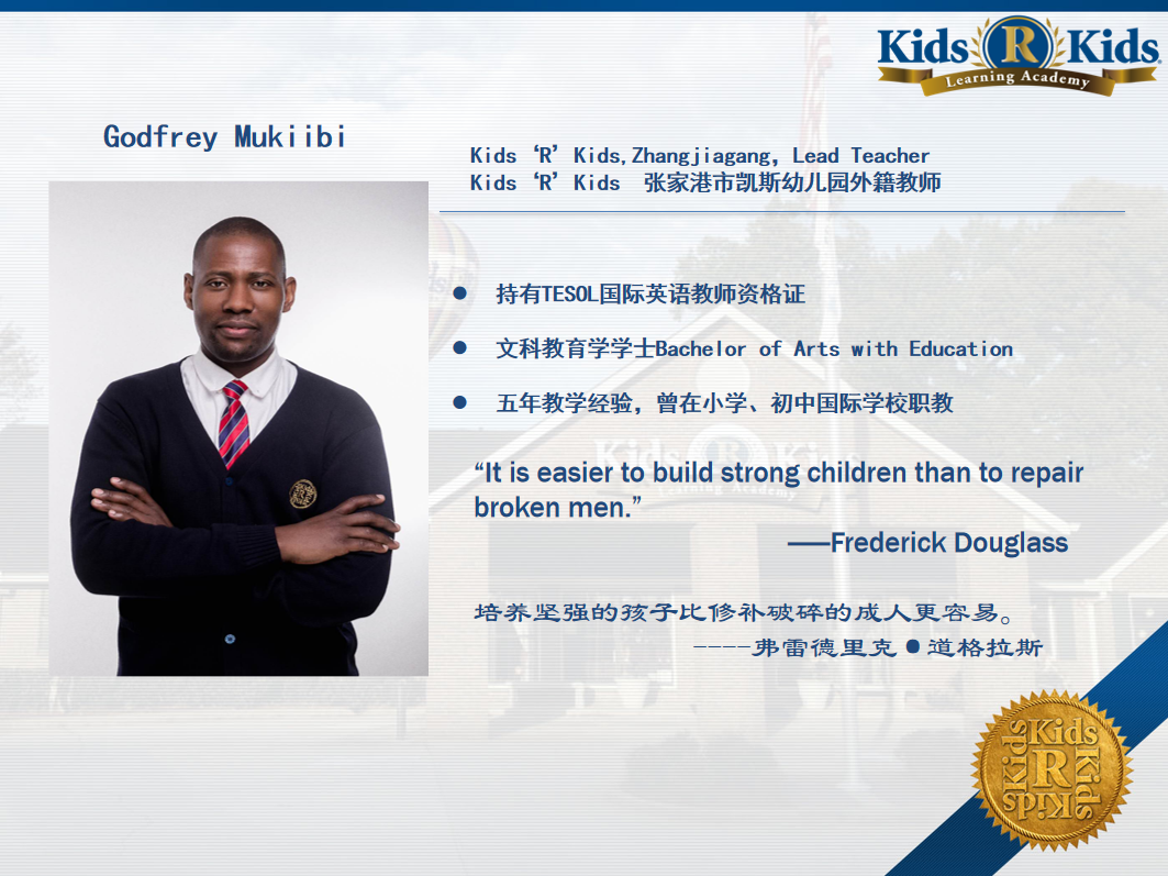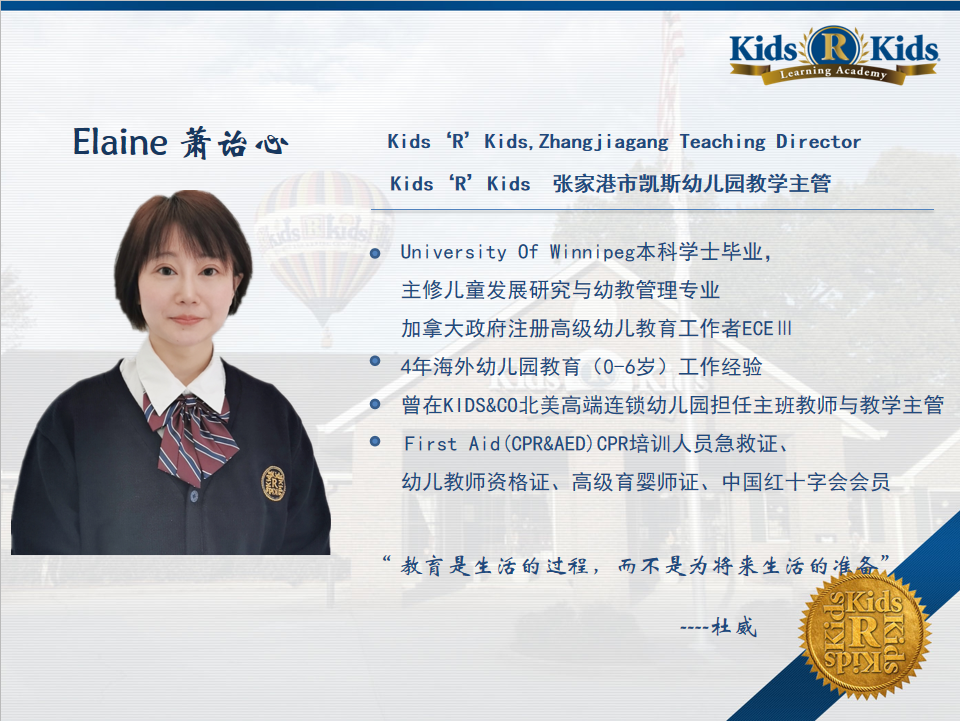 Kids 'R' Kids一直坚持的理念就是“Hug First, Then Teach(先拥抱孩子,再教授知识)”,我们致力于为孩子营造一个安全友爱的环境,让孩子在安心舒适的氛围里学习和成长。