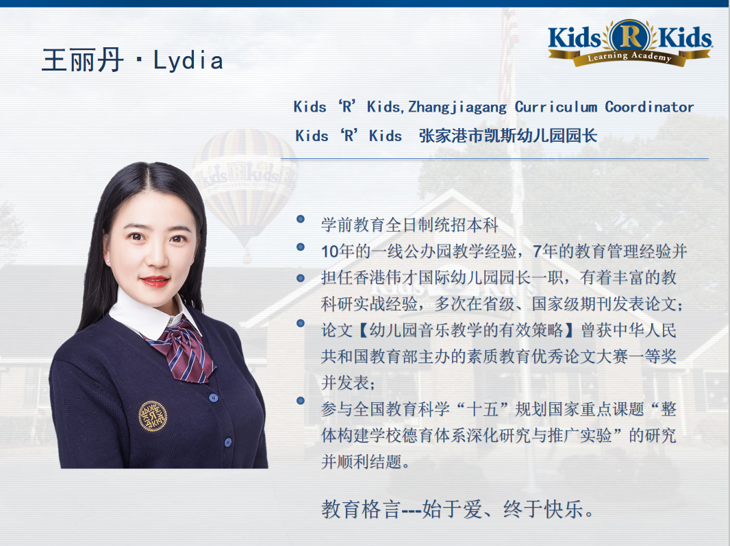 园长简介:学前教育全日制统招本科;10年的一线公办园教学经验,7年的教育管理经验,曾担任香港伟才国际幼儿园园长一职,有着丰富的教科研实战经验,多次在省级、国家级期刊发表论文;曾参与全国教育科学“十五”规划国家重点课题“整体构建学校德育体系深化研究与推广实验”的研究并顺利结题。