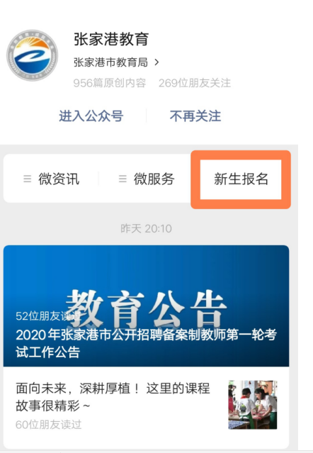1.打开“张家港教育”微信公众号,点击“新生报名”