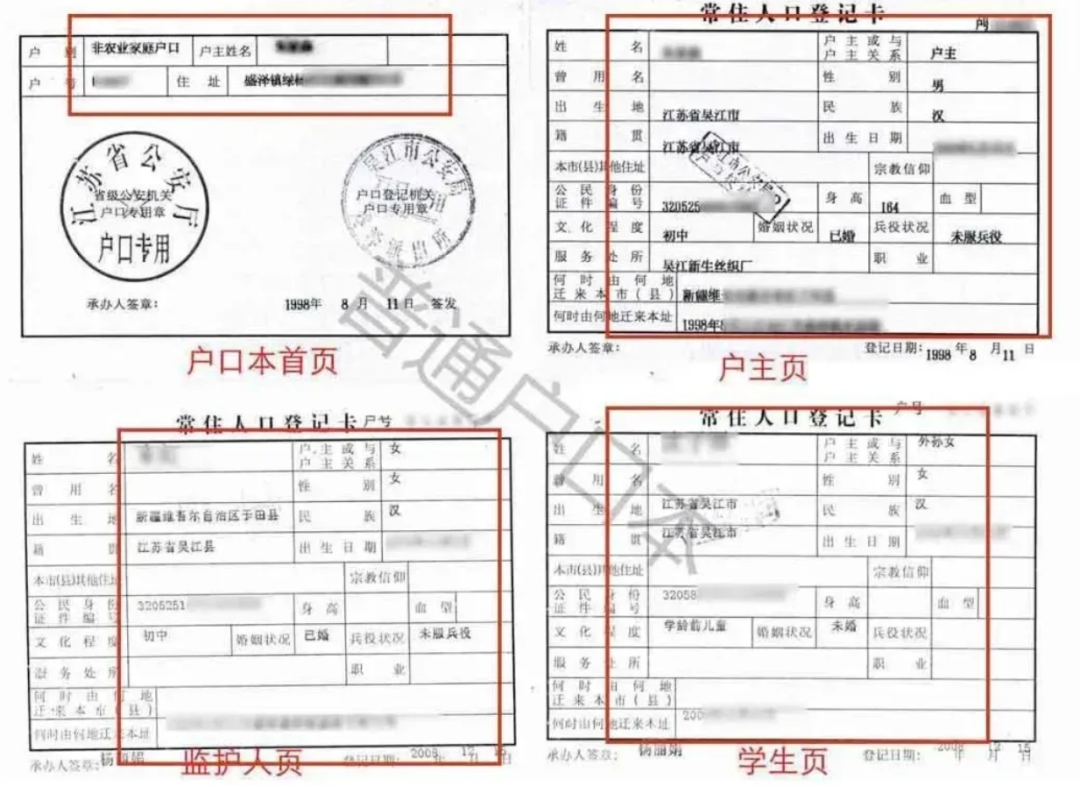2.上传的户口本首页、户主页、儿童页、父母页的样图照片参考如下: