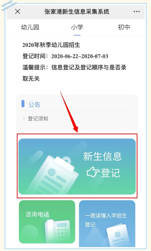 打开“张家港教育”微信公众号,点击“新生报名”