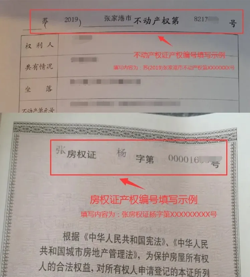 ②房产证编号正确填写格式如下:张房权证杨字第xxxxxx号或苏(20xx)不动产权第xxxxxx号。