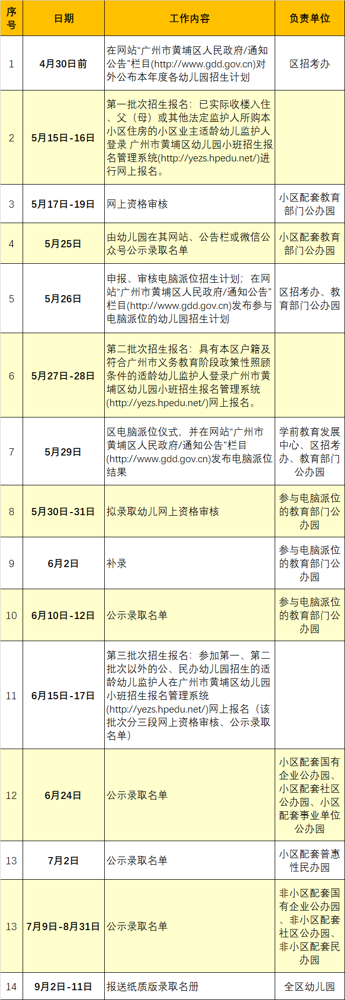 01 招生计划 普惠班:面向黄埔区户籍富春山居业主子女适龄儿童(统一在黄埔区招生平台上报名网上摇珠录取) 1、幼儿小班60人:2016年9月1日至2017年8月31日出生 2、中大班少量插班学位 国际班:面向富春山居业主子女及周边适龄儿童适龄儿童 1、 幼儿小班60人:2016年9月1日至2017年8月31日出生 2、 幼儿中、大班少量插班学位 02 准备证件资料 1、幼儿出生证明原件和复印件; 2、幼儿的户口簿原件和复印件; 3、幼儿保健手册原件; 4、父母双方身份证原件和复印件; 5、幼儿体检结果; 6、报读普惠班需要提交富春山居的房产证或购房合同 03 招生程序 1、国际班:请5月6日开始预约到幼儿园现场报名。 2、普惠班网上报名:6月15日至6月17日,已实际收楼入住、父(母)或其他法定监护人所购本小区住房的小区业主适龄幼儿监护人登陆招生报名管理系统(http://yezs.hpedu.net/)进行网上报名(6月15日上午9:00时开启报名服务器—6月17日下午17:00关闭报名服务器)。 特别提醒:网上报名需如实填写幼儿户籍、住房等信息,避免因信息不符、提供虚假资料、佐证材料不齐全等原因错失录取资格。 黄埔区2020年 幼儿园招生工作日程 黄埔区2020年幼儿园 招生网上报名须知 一、2020年我区幼儿园招生报名分三批次进行: (一)申请小区配套教育部门公办园学位的符合条件的小区业主适龄幼儿父(母)或其他法定监护人于5月15日(5月15日上午9:00时开启报名服务器)—5月16日(5月16日下午17:00关闭报名服务器),登录广州市黄埔区幼儿园小班招生报名管理系统(http://yezs.hpedu.net/)进行网上报名。 (二)申请面向全区的区教育部门公办园电脑派位招生学位的适龄幼儿父(母)或其他法定监护人于5月27日(5月27日上午9:00时开启报名服务器)—5月28日(5月28日下午17:00关闭报名服务器)登录广州市黄埔区幼儿园小班招生报名管理系统(http://yezs.hpedu.net/)进行网上报名。5月15-16日,申请小区配套教育部门公办园学位的符合条件的小区业主幼儿父(母)或其他法定监护人需要再次登录广州市黄埔区幼儿园小班招生报名管理系统(http://yezs.hpedu.net/)填报该批次志愿的,登录账号、密码不变。 (三)申请第一、第二批次以外的公、民办幼儿园招生学位的适龄幼儿父(母)或其他法定监护人于6月15日(6月15日上午9:00时开启报名服务器)—6月17日(6月17日下午17:00关闭报名服务器)登录广州市黄埔区幼儿园小班招生报名管理系统(http://yezs.hpedu.net/),进行网上报名。5月15-16日、5月27-28日申请教育部门公办园学位的符合条件的小区业主幼儿父(母)或其他法定监护人需要再次登录广州市黄埔区幼儿园小班招生报名管理系统(http://yezs.hpedu.net/)填报该批次志愿的,登录账号、密码不变。 二、具备黄埔区户籍及符合广州市义务教育阶段政策性照顾条件、年满3周岁(2016年9月1日至2017年8月31日出生)的适龄幼儿,可由幼儿父(母)或其他法定监护人代为报名参加2020年面向全区的区教育部门公办园电脑派位招生。 三、幼儿父(母)或其他法定监护人必须使用幼儿本人身份证件号进行登记注册,使用其他人身份证件号登记注册的,将取消录取资格。字库中没有的生僻汉字请用同音字并加圆括号表示,例如:“(山)”。 四、幼儿父(母)或其他法定监护人必须如实填写信息、上传资料。上传的资料必须真实有效。填写、上传的资料与事实不符的,一律取消录取资格。幼儿的父(母)或其他法定监护人在报名期间通过网上报名管理系统提供、上传涉及幼儿资格信息的佐证材料,具体包括: (1)幼儿近期上半身彩照电子版,大小<60K。 (2)监护人与幼儿共同户口簿(首页,监护人页,幼儿页)。 (3)监护人二代身份证(正、反面)。 (4)幼儿出生证。 (5)不动产权证、房产证或其他居住地址佐证材料。 五、符合条件的每名幼儿父(母)或其他法定监护人可在第一批次(小区配套教育部门公办园招生)、第二批次(面向全区的区属教育部门公办园招生)、第三批次第一段(小区配套国有企业公办园、小区配套社区公办园、小区配套事业单位公办园招生)、第三批次第二段(小区配套普惠性民办园招生)代为报名分别填报1所幼儿园志愿,第三批次第三段(非小区配套国有企业公办园、非小区配套社区公办园、非小区配套民办园招生)填报3所幼儿园志愿。 六、填报资料后,请妥善保管登录密码等相关信息。如因个人原因造成密码被他人盗用造成的后果,责任由幼儿父(母)或其他法定监护人自负。报名截止后,逾期未确认的所填信息无效。 七、双胞胎(多胞胎)网上报名可在以下两种方式中任选其一,一经选定不得更改。第一种方式为“一号报名,同园录取”,用一个幼儿信息进行网上报名,务必在该幼儿姓名后备注(双胞胎或多胞胎信息);第二种方式为“多号报名,按实录取”,网上报名时填报两(多)张报名表、两(多)个幼儿资料。 八、区教育局招生政策咨询电话82116638、82116612;网上报名技术咨询电话:15774000770、15817199417;网上报名技术支持QQ:1520105362。 04 录取流程 国际班:请7月2日到幼儿园正门保安处领签录取通知书。 普惠班:请于7月2日到幼儿园正门保安处领签录取通知书。 3、幼儿被我园录取后请家长于7月7-8号带齐证件资料原件及复印件到幼儿园进行资料查验。8月15日前到“黄埔区黄坡社区医院”(在惠联路62号,电话87714393)进行入托体检。 4、请家长于8月15日带同孩子的录取通知书及体检结果到幼儿