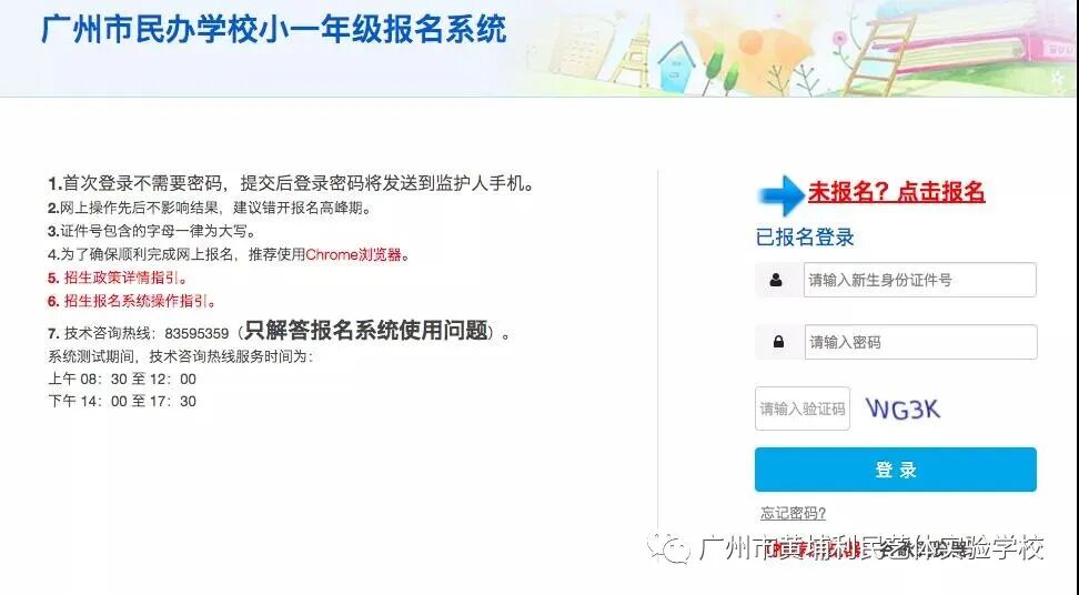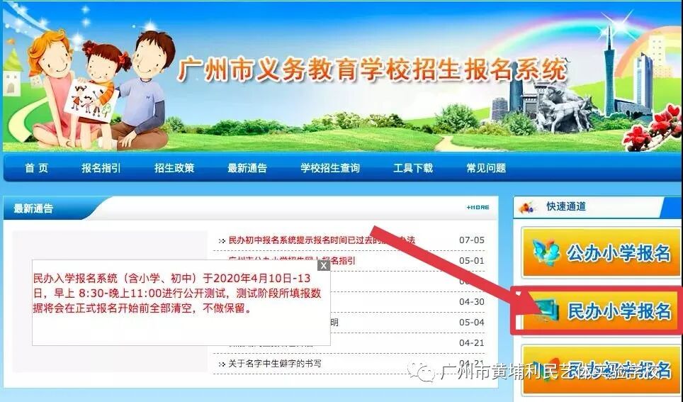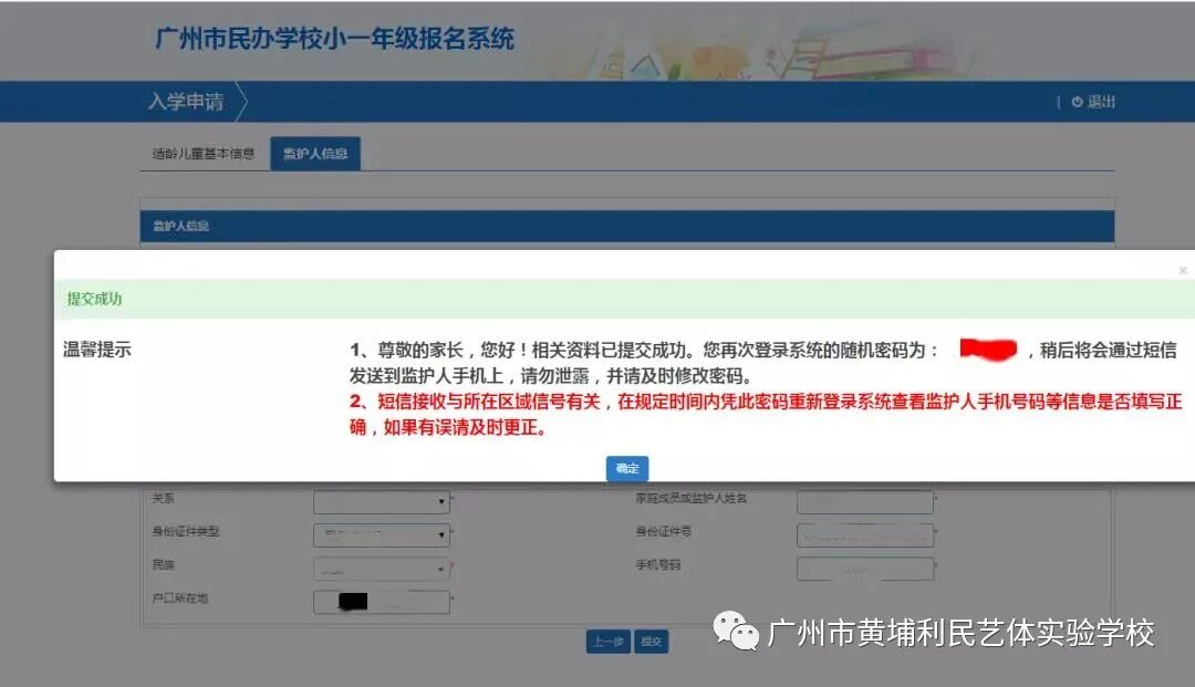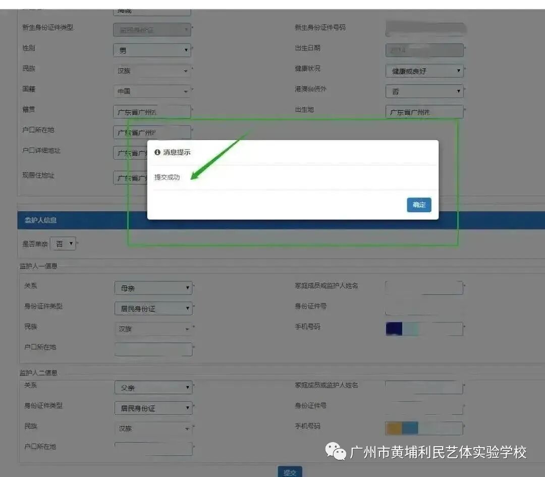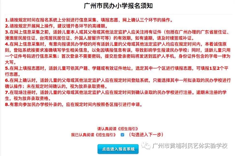 01 进入系统并阅读报名须知 点击民办小学报名,请仔细阅读报名须知后,勾选【我已认真阅读《招生指引》】,进入下一步; 02 注册账号 点击:未报名?点击报名 03 填写报名信息 注意: (1)小学报名系统分为【适龄儿童基本信息】、【居住证信息】和【监护人信息】三项需要填写; 根据提示填写好【监护人信息】后,点击【提交】。 04 手机短信通知 收到【报名系统短信】,再次登录广州市义务教育学校招生报名系统,及时修改密码。 系统上出现【提交成功】,按【确认】即可。 05 志愿学校填报 采集信息阶段结束后,家长需登录报名系统进行填报志愿信息。志愿学校选择为 平行志愿,至少选择 1 所学校,最多可填报 2 所。欲报我校,请搜索并选择“广州市黄埔利民艺体实验小学”。 确认信息后请下拉页面到最底部,并按【提交】完成志愿学校择校操作。 06 网上确认 招生咨询电话: 020-82397538 18022319145 18022319149 18022319085 13822206636 学校地址: 广州市黄埔区南岗街广海路188号大院8号