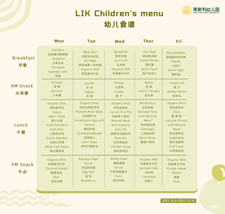 每周的饮食搭配也是由保健医生结合孩子营养需求来定制,保证宝宝可以茁壮成长。在特定的节日或日子,还会推出不同地域的美食,让孩子了解世界多元文化。