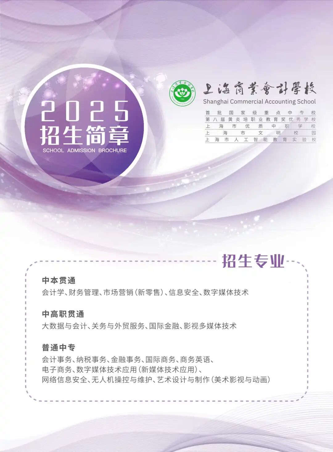 经上海市教委批准,2025年上海商业会计学校统招批招生计划为496人,分区计划及专业设置详见下表: ★招生计划 ★招生专业 注: 1.学费标准:4000元/学年,美术影视与动画专业学费6000元/学年。 2.住宿情况:高德地图公交地铁单程100分钟以上者经批准可住宿。 ★报考方法 1.符合2025年上海市教委、市教育考试院规定的中考招生报名条件的考生。 2.学制3年。分区按计划招生,男女兼收。 考生需根据区中招办安排,参加2025年上海市初中学业水平考试。 1.不需要面试。 2.考生须在6月17-20日期间,登录“上海招考热线”(www.shmeea.edu.cn),网上填报统一招生志愿代码。我校统一招生志愿代码为201001。 3.友情提醒:意向就读我校的考生可把我校志愿作为高中之后的第一志愿填报,以提高录取概率。 完成志愿填报的考生,须根据要求,本市应届初三学生在学籍学校进行志愿书面签字确认;往届生、返沪生在报名所在区招考机构进行志愿书面签字确认。 统一招生由各区中招办按规则投档录取,我校按录取名单制作并发放录取通知书。 ★其他信息 ★毕业去向: ★资助奖励: