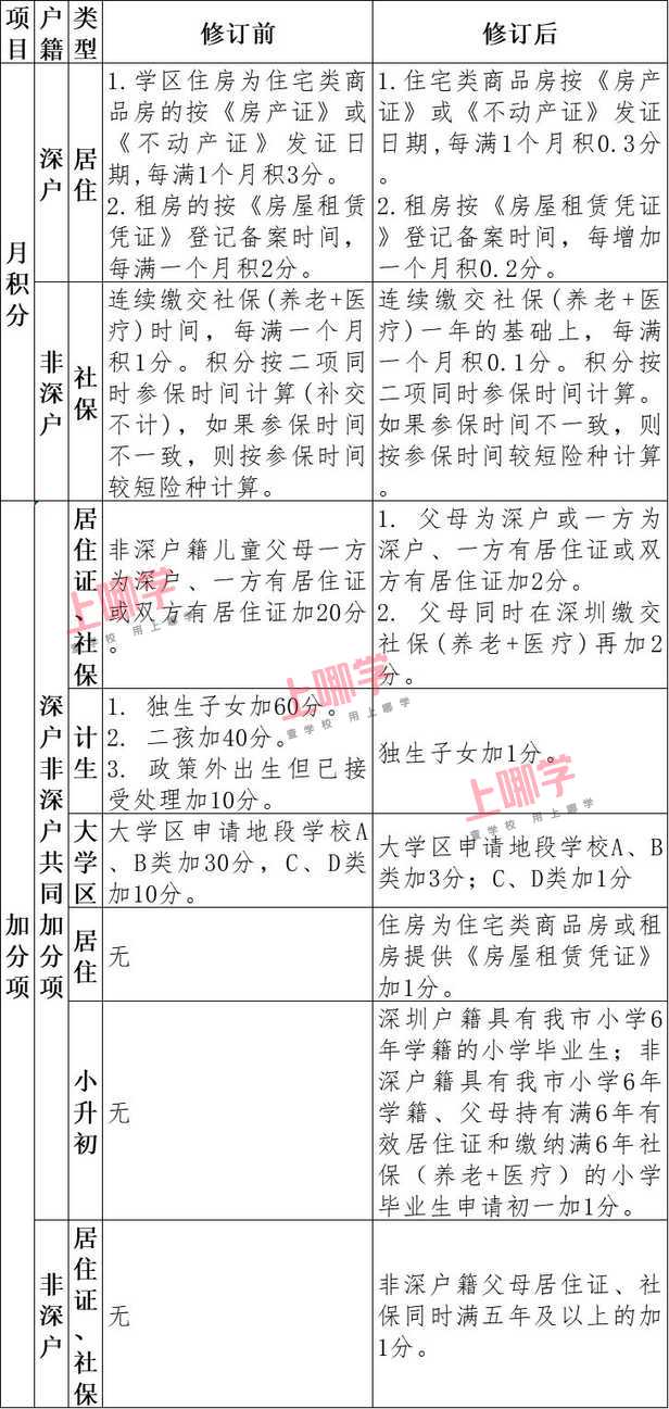 申请儿童父母(监护人)连续缴交社保(养老+医疗)一年的基础上,每增加1个月积0.1分。积分按二项同时参保时间计算(补交不计)。如果参保时间不一致,则按参保时间较短险种计算(以社保局比对验核结果为准)。3.加分:按相关政策要求,对不同情况给予一定加分。②实行大学区招生的地段,申请原地段学校的A、B类加3分;C、D类加1分。③住房为住宅类商品房或租房提供《房屋租赁凭证》加1分。④父母为深户或一方为深户、一方有居住证或双方有居住证加2分;父母同时在深圳缴交社保(养老+医疗)再加2分。⑤非深户籍父母居住证、社保同时满五年及以上的加1分。⑥深圳户籍具有深圳市小学6年学籍,非深户籍具有深圳市小学6年学籍、父母持有满6年有效居住证和缴纳满6年社保(养老+医疗)的小学毕业生申请初一加1分。(注:④⑤⑥项单亲家庭视实际情况加分。离异家庭能同时提供孩子父母双方居住证和社保证明且符合条件的,享受同样加分。)1.“住宅类商品房”系指房产用途为“住宅”或“商住两用”,有合法产权证明的商品房。2.“原居民祖屋”如果没有合法产权证明,由股份公司证明儿童父母(或监护人)为原居民并拥有产权。3.军产房、集资房、自建房、商务公寓,房产确属儿童父母(或监护人)所有并实际居住的,按特殊房产处理。