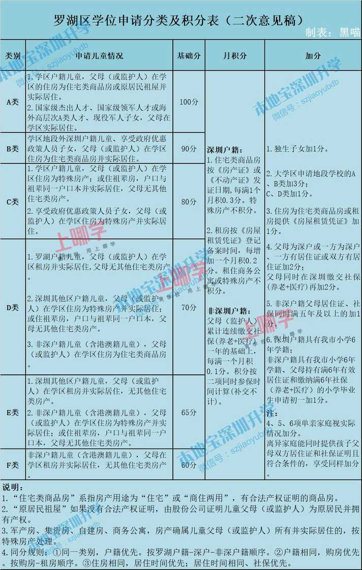 ①同一类别,户籍优先。按罗湖户籍——深户——非深户籍顺序。③住房相同,居住时间优先;居住时间相同、社保优先。(一)招生系统根据申请儿童及监护人网上填报的入学申请信息,自动给出学位申请初始类别和积分;学校根据申请儿童提交的学位申请材料和有关部门的比对复核结果,确认该申请儿童的学位申请类别和积分。(二)采取“类别+积分,类别优先,后取积分”积分入学办法。录取时,视学位数量划定类别/积分线,按申请儿童的类别/积分高低和志愿顺序由申请系统电脑排位录取。同类别按积分从高到低录取。积分只在同一类别的申请儿童之间比较。《罗湖区义务教育学位申请分类和积分办法(征求意见稿)》修订说明