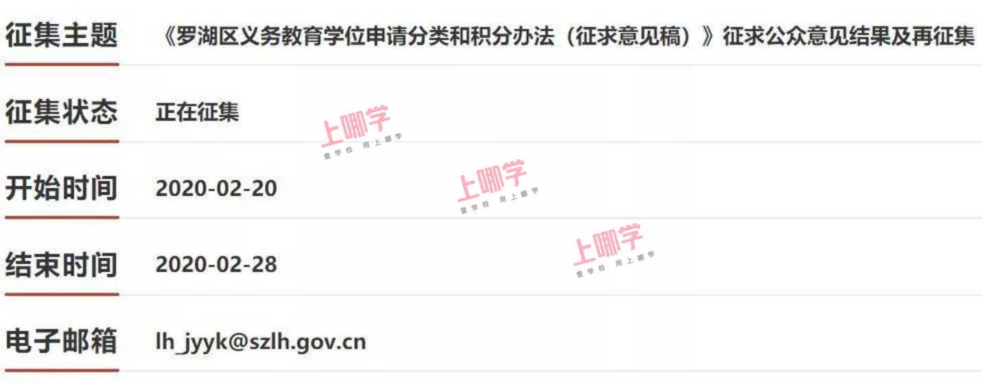 51注意了!罗湖区学位类别及积分规则第一次调整结果已经出来了,积分办法再次有调整。2020年2月20日,罗湖区教育局发布《罗湖区义务教育学位申请分类和积分办法(征求意见稿)》征求公众意见结果及再征集。家长们可以在2月28日前将修改意见发送到邮箱。注意!今年的幼升小报名还没开始,往年是4月下旬开始网上预报名,5、6月进行资料核验,今年还没通知,请大家关注“深圳幼升小”,深圳幼升小君会第一时间通知的。