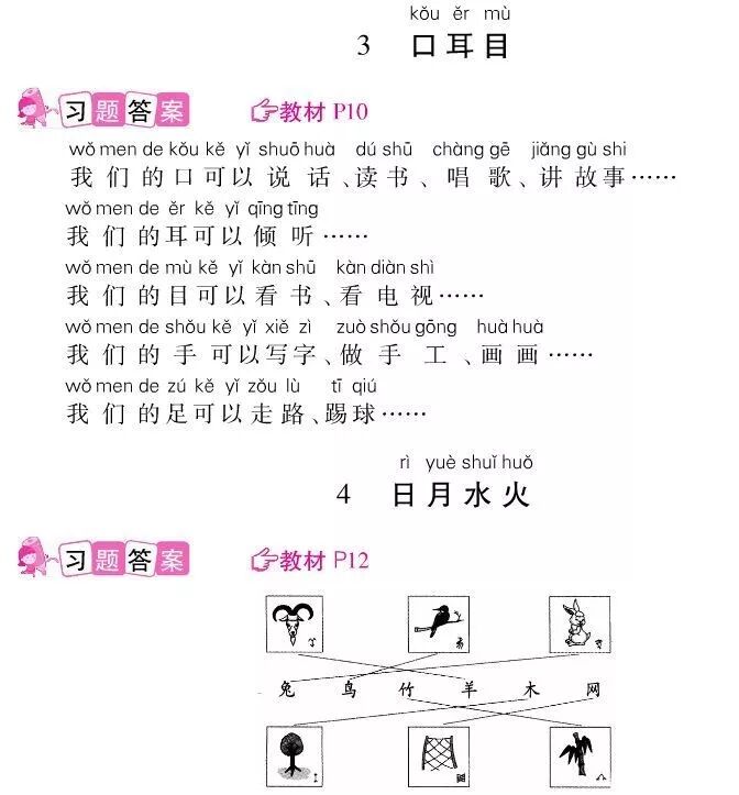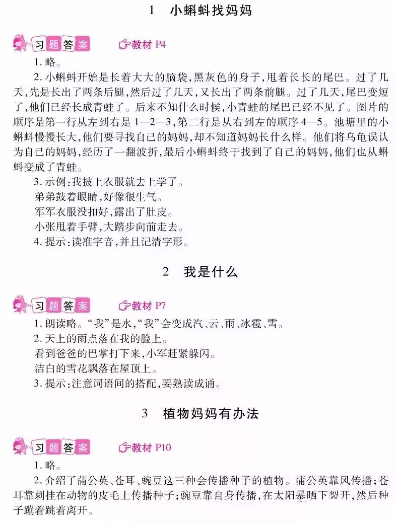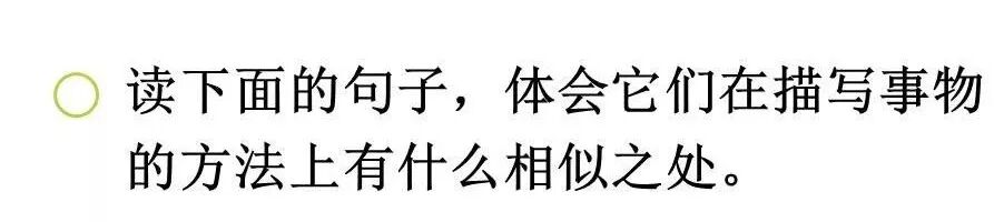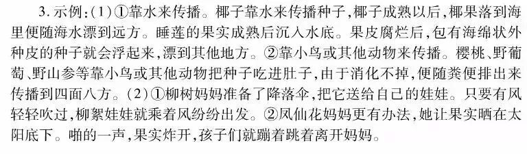 一年级(第一单元课后习题参考答案) 二年级(第一单元课后习题参考答案) 三年级(第一单元课后习题参考答案) 第一课《大青树下的小学》 一、朗读课文,在文中画出有新鲜感的词句与同学交流。 (有新鲜感的词句”是指运用比拟、比照、比喻等等修辞手法的有关词句,使用修饰限定方法写具体形象的有关词句,以及进行细致描述细节的有关词句。而这样的词句,学生读后感到写得生动有趣、具体形象,有耳目一新的感觉。) 1、早晨,从山坡上,从坪坝里,从一条条开着绒球花和太阳花的小路上,走来了许多小学生,有傣族的,有景颇族的,有阿昌族和德昂族的,还有汉族的。 这句话告诉我们这些来自不同民族的小朋友,早早地起床,迎着朝阳,踩着露珠,高高兴兴地朝着一个共同一个地方──学校走去。这句话描绘出众多的学生由远及近汇集而来的壮观景象了。句子中用了三个“从……”相似的结构的词语,和“有……有……有……还有……”让我们一读就在脑海里能形成清楚具体的画面,读起来朗朗上口,形成一定的语势,给我们有身临其境、耳目一新的感觉。这样的词句,我们叫它为“有新鲜感的词句”。 2、大家穿戴不同、语言不同,来到学校,都成了好朋友。那鲜艳的民族服装,把学校打扮得更加绚丽多彩。 这句话告诉我们这是一所民族团结的学校。大家虽然来自不同的家庭,来自不同的民族,穿戴不同,语言不同,但都成了好朋友。在祖国的大家庭里,在鲜艳的五星红旗下共同过着幸福的学习生活。“穿戴不同”“鲜艳的服装”“绚丽多彩”形成“绚丽多彩的学校”画面。 3、同学们向在校园里欢唱的小鸟打招呼,向敬爱的老师问好,向高高飘扬的国旗敬礼。 这一句课文作了提示“我好象看到了这样的情景”这是想象的句子。这句话中连续用了三个“向……”,形成“进行各种活动”的画面。写出了学校的生活的美好,孩子们来到学校时的欢快心情。 4、最有趣的是,跑来了几只猴子。这些山林里的朋友,是那样好奇地听着同学们读课文。下课了,大家在大青树下跳孔雀舞、摔跤、做游戏,招引来许多小鸟,连松鼠、山狸也赶来看热闹。 这句话写出了操场上到底怎样热闹,课间活动丰富多彩,引得小动物心生羡慕,也前来看热闹。句子用拟人的手法把小鸟,松鼠、山狸写成了会看热闹的人,小动物们的出现更加突出了民族小学的特点,为学校增添了欢快活泼的气氛,也突出了孩子们的愉快心情。 5、这时候,窗外十分安静,树枝不摇了,鸟儿不叫了,蝴蝶停在花朵上,好像都在听同学们读课文。 作者把树枝、鸟儿、蝴蝶和猴子当成人了,成了朋友,所以作者说这些山里的朋友“都在听”“好奇地听”。 二、这所学校有哪些特别的地方?用自己的话说一说。 提示: 大青树下的小学是一所边疆的山里的多个民族小学,是一所可爱的小学。 大青树下的小学是一所可爱的多个民族小学,是一所边疆山里的小学。 大青树下的小学是一所可爱的边疆山里的小学,是一所多个民族的小学。 三、你的学校是什么样的?同学们在学校里做些什么?选择一个场景说一说 示例: 下课了,同学们在操场上锻炼身体,有打篮球的,有踢足球的,还有跑步的,有玩“老鹰捉小鸡”的……真是热闹极了! 上课了,同学们一个个坐得像松树一样挺直。语文老师拿着教材和备课本急匆匆地走进教室。老师亲切地说:“上课。”班长高声地说:“起立。”同学们齐声说:“老师好。”老师和蔼地说:“同学们好。”班长说:“坐下。”一节有趣的语文课开始了。 教室里,同学们正在安静地听老师上课,他们时而冥思苦想,时而踊跃发言,时而合作谈论,真是一节有趣的课。 图书室里,同学们安静地阅读,没有交谈、没有走动,只听见纸张翻动和笔尖滑动的沙沙声。 下课了,同学们来到操场上,打球、跳绳、踢毽子,玩得不亦乐乎,连路过操场的老师们都露出微笑,为他们点赞。 花坛边,聚集了好多小朋友,他们有的凑到鲜花边上,闻闻花香;有的摆上画架,画画盛开的花朵;还有的像快乐的小蝴蝶一样,绕着花坛翩翩起舞。 第二课《花的学校》 1、朗读课文,想象花“在绿草坪上跳舞、狂欢”的情景。 提示:一边读课文,一边画出,描写花在绿草上“跳舞、狂欢“的句子,然后相信他们是怎么样跳舞、狂欢的。想象一下他们的舞姿是怎么样的,情景是怎么样的;狂欢的时候会说什么,做什么。 2、读课文的时候,你注意到下面加点的部分了吗? 湿润的东风走过荒野,在竹林中吹着口笛。 树枝在林中互相碰触着,率也在狂风里簌簌地响,雷云拍着大手。 提示:加点部分都是拟人化的短语,通过拟人形象生动地描述了东风、树枝和雷云的动作,让我们感受到雷雨交加的恶劣天气,花在跳舞、狂欢时热烈的气氛,体会到花孩子愉快的心情。 3、“雨一来,他们便放假了”。你喜欢这样的表达吗?请照样子写一写,如,“清风一吹,他们……”“蝴蝶一来,他们……” 答案: 清风一吹,它们便跳起了轻快的舞。 蝴蝶一来,他们便撒欢了。 清风一吹,他们便去旅行了。 蝴蝶一来,他们便打开大门欢迎。 清风一吹,他们便礼貌地打着招呼。 蝴蝶一来,他们便大方地献上花粉招待客人。 语文园地一 四年级(第一单元课后习题参考答案) 第一课《观潮》 一、说说课文是按照什么顺序描写钱塘江大潮的,你的头脑中浮现出怎样的画面,选择印象最深和同学交流。 答:课