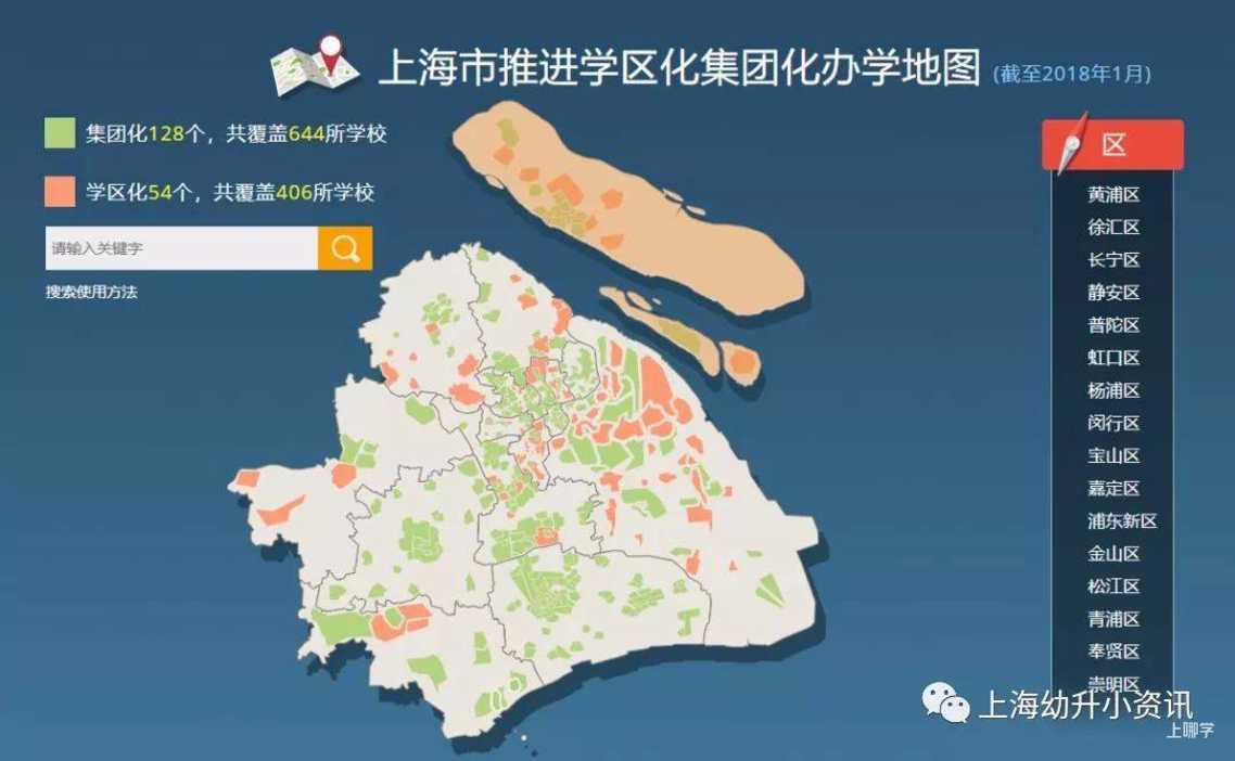 截至2019年4月,上海集团化143个,共覆盖743所学校;学区化55个,共覆盖416所学校。在上哪学公众号菜单栏——升学工具——学区化集团化地图,可查询详细学校名单。