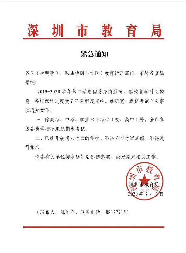 - 刚刚!深圳教育局紧急通知!全市各级各类学校不组织期末考试!