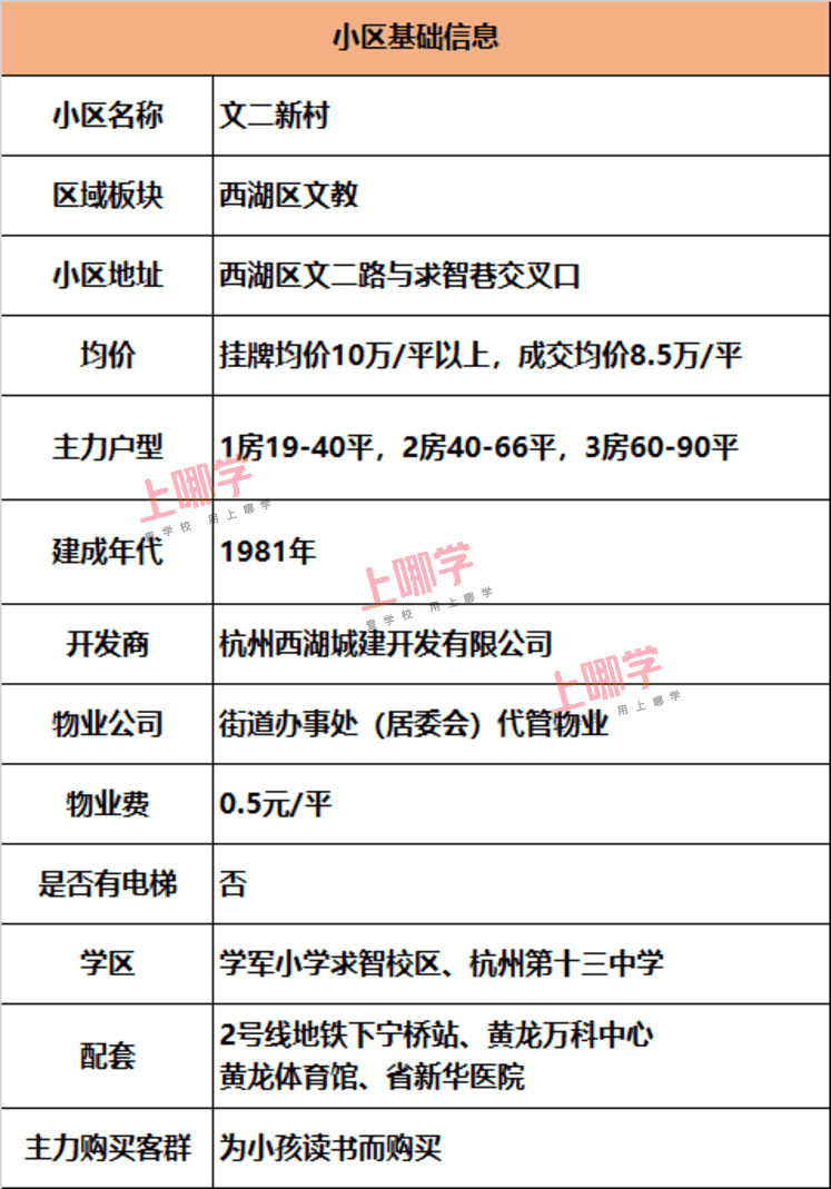 历史成交高峰 成交时间 面积 成交总价 17年10月 29.58平 14.19万/平 420万 18年6月 19.84平 15.12万/平 300万 18年11月 31平 11.22万/平 348万 19年12月 40.34平 11.47万/平 463万 20年4月 29.58平 14.19万/平 420万 以上的成交数据均来自于学军小学学区房文二新村的几次历史成交高峰,一个81年建成的老小区,成交均价屡屡破10万。 其中19.84平的小房子都不能满足基本的居住需求,却凭借总价低卖到了15万/平,足见大家对于学区的疯狂程度。 19平房源的户型示意图 今天的全文就来解析下学军小学求智校区的学区房代表,文二新村的价值评测。 文二新村基本情况介绍 16幢多层,81年的老小区 文二新村位于西湖区文教板块,小区于1981年建成,共计16幢,都是6-7层到顶的多层建筑。 外立面大部分采用浅灰色的涂料,少部分沿街楼幢采用黄色涂料。 内部绿化一般,树木基本沿路而种。 小区里停车困难,总户数有700多户,但车位仅80个左右,特别是到晚高峰,停车难度更加大,没有车位可以到求智巷路边看看有没有路边划线停车位。 文教板块位于是西湖区,是以文化教育、科研为主的城市功能区,这里聚集了杭州最强的教育资源,生活配套方面也是较齐全的。 文二新村距离最近的地铁站是2号线下宁桥站,仅200米。 虽然2号线在2014年11月就已经开通了,但下宁桥站因为出入口不达标至今没有通车,根据最新消息,6月底,下宁桥站也将开通,届时,出行就更加方便。(不过,下宁桥站放鸽子已经不是一次两次了,这次到底能不能开,表示怀疑) 购物餐饮方面,小区楼下沿街底商还是较多的,种类也比较齐全,平时买菜、吃饭完全可以满足,如果想要到大一点的综合体,距离较近的就是黄龙万科中心约2.2公里。 购买文二新村学区房的家长必然对学习重视无比,刚好文二新村距离博库书城非常近,出了小区门过了马路即可到达,购买学习用品书籍都相当便利。 另外,文二新村距离省新华医院也近,平时就医也方便;距离西湖景区也近,约3公里左右,是周末休闲放松的好去处。 文二新村小学学区是学军小学求智校区,中学是十三中,这应该是杭州最强的教育组合了。 学军小学求智校区创办于1908年,是有百年历史又具现代气息的浙江省实验小学,是西湖区小学的第一梯度。 除了文二新村之外,该片区内还要很多对口小区,如中大文锦苑、求智巷、西溪河东,但文二新村算是最便利的,离地铁近、离学校近。 不过学军小军2020年-2022年都已经红色预警,意味着打算购买学区房的家长至少需要提前三年购入,但也不一定能在学军小学求智校区上学,如果爆表,爆表部分将被调剂到杭州钱塘外国语学校,借用其场地,由学军小学的老师过去上课,这种操作估计部分家长心里还是会有疙瘩。 杭州市十三中教育集团前身为创办于1969年的杭州市第十三中学,即杭州师范学院附中,系省一级重点中学。学校师资力量强大,中考成绩一直名列前茅。 2018年中考成绩单:前3所共59人,省一级重高(4-12所)人数178人,优高(13-22所)人数168人,市外、省外国际班以及国外留学共26人。前3所一级重高59人,占10.4%。前12所一级重高237人,占41.8%。第一批重高59+178+168=405人,占71.4%。 目前十三中对应的小学范围较大,已经超负荷,但十三中已经有扩建计划,将在原有基础上,新建一幢5F的教学楼、一幢6F的综合实践楼。 十三中扩建,意味着未来几届该学区的孩子上该所学校的概率增加,是个好消息! 主力户型分析 户型面积都较小 文二新村1居最小19平,最大有40多平的。 19平的就是文中开头所展示的,连厨房都没有,仅一个卧室加一个卫生间。 29平格局也很简单,卧室相对宽敞带一个阳台,厨房卫生间面积较小。 19平户型 33平的相比29平的稍微宽敞一些,留出了一些过道。 48平的一居室就很宽敞了,有一个12平的餐客厅,活动就比较宽敞了,原本很宽敞的卧室被隔成了2个。 2居室基本以40-66平为主。 46平的2居室基本是没有客厅的,就厨房卫生间加2个卧室,想这种两个卧室朝南的户型已经算两居室中比较好的了。 53平的2居,南北户型,厨卫全明。 62平的2居室居住就相对舒适了,也是文二新村比较难得的好户型。 3居室的面积基本在60-90平之间,但目前拿出来卖的较少。 此户型为72.31平,2南1北的格局,还算方正。 72.31平户型 市中心八几年的房子,格局都不会太好,且每套房子的格局都会有差异,更谈不上居住的舒适度。 一、市场成交情况分析: 根据网签数据得出,文二新村近11个月的市场成交均价在7.8万到9.4万之间徘徊,去年6月的成交均价最高有94032元/平,今年4月的成交均价最低仅78931元/平,整体的成交均价在85811元/平。 在所有成交房源中,2居室的成交最多,占了48.48%,其次是3居室。 目前文二新村的成交总价已经是300万起步的,300-400万之间的总价基本没什么房源,仅占总成交的9.09%。 楼层对于房价的影响还是较明显的,中间楼层的均价最高,其次是低楼层,最后是高楼层。 不同居室的成交均价也不同,其中2居室的成交均价最高,其次是1居的,最后是3居的。 (以上数据均根据网签数据统计得出,部分房源存做高或做低,导致均价会有出入) 咨询了周边中介门店,据悉公民同招之后,学军小区学区房需求量明显增加,供不应求,目前大部分房源挂牌价格都在10万以上,成交价格也上浮了不少,5月份很多房源的成交均价超过了10万/平。 二、推荐购买建议: 不自住的前提下: 1、推荐购买低总价房源,一居室的面积