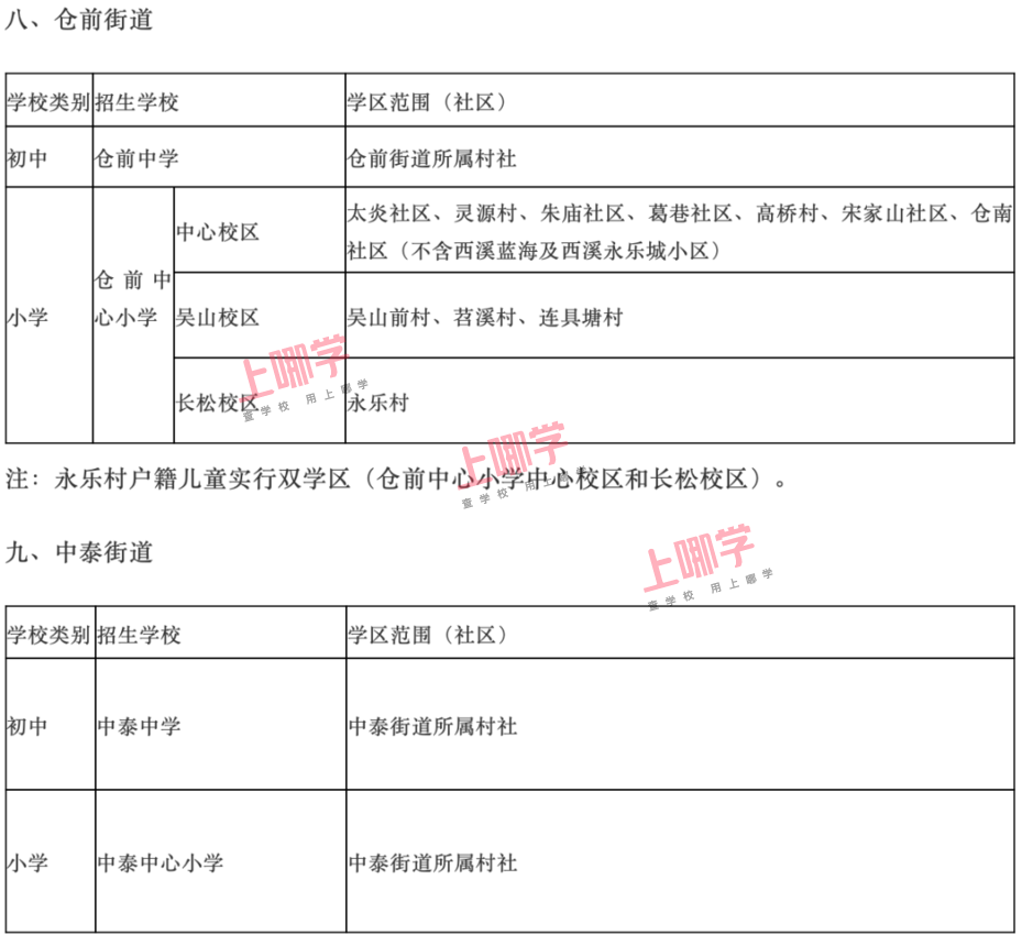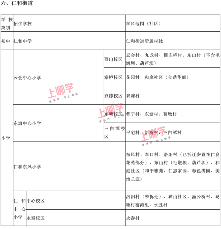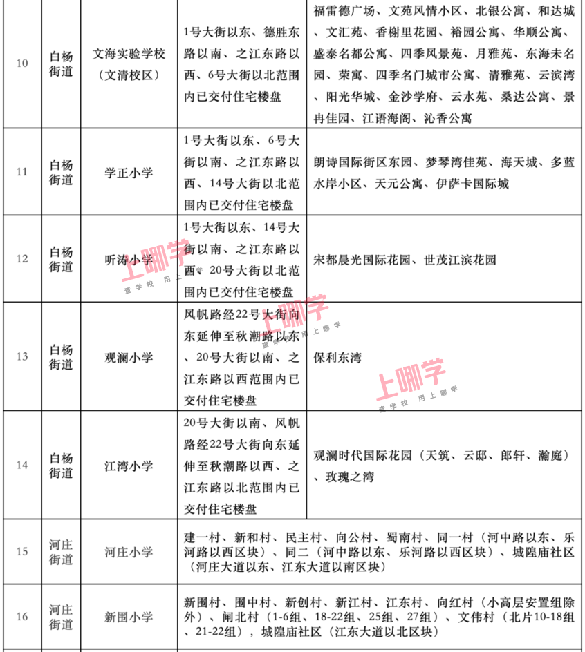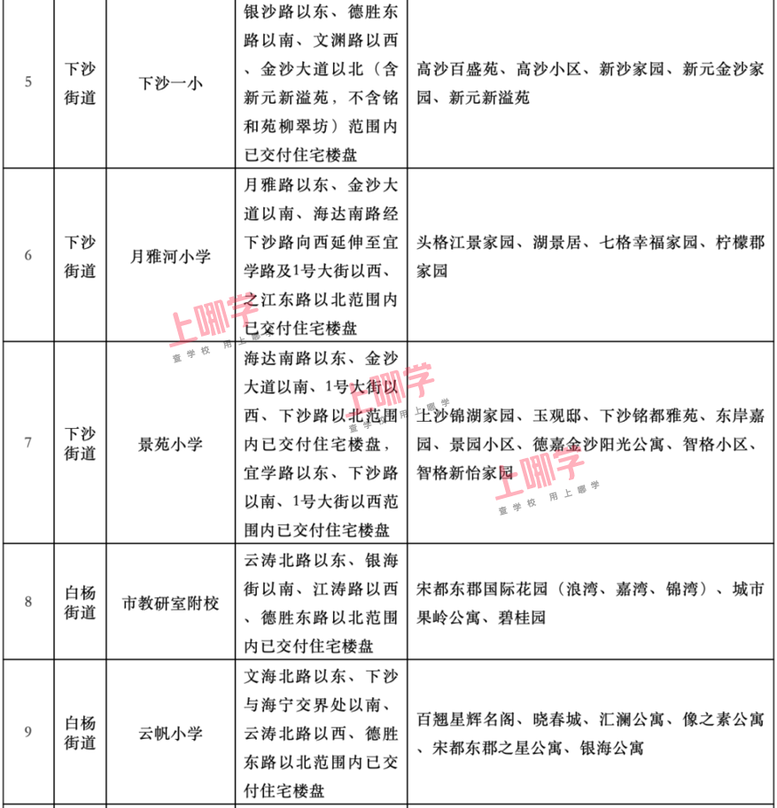 2.下列教育服务区(学区)仅包含已经区教育行政部门明确的住宅。以后新建或改扩建的住宅,将另行确定其教育服务区,并以区教育行政部门公布的文件为准。