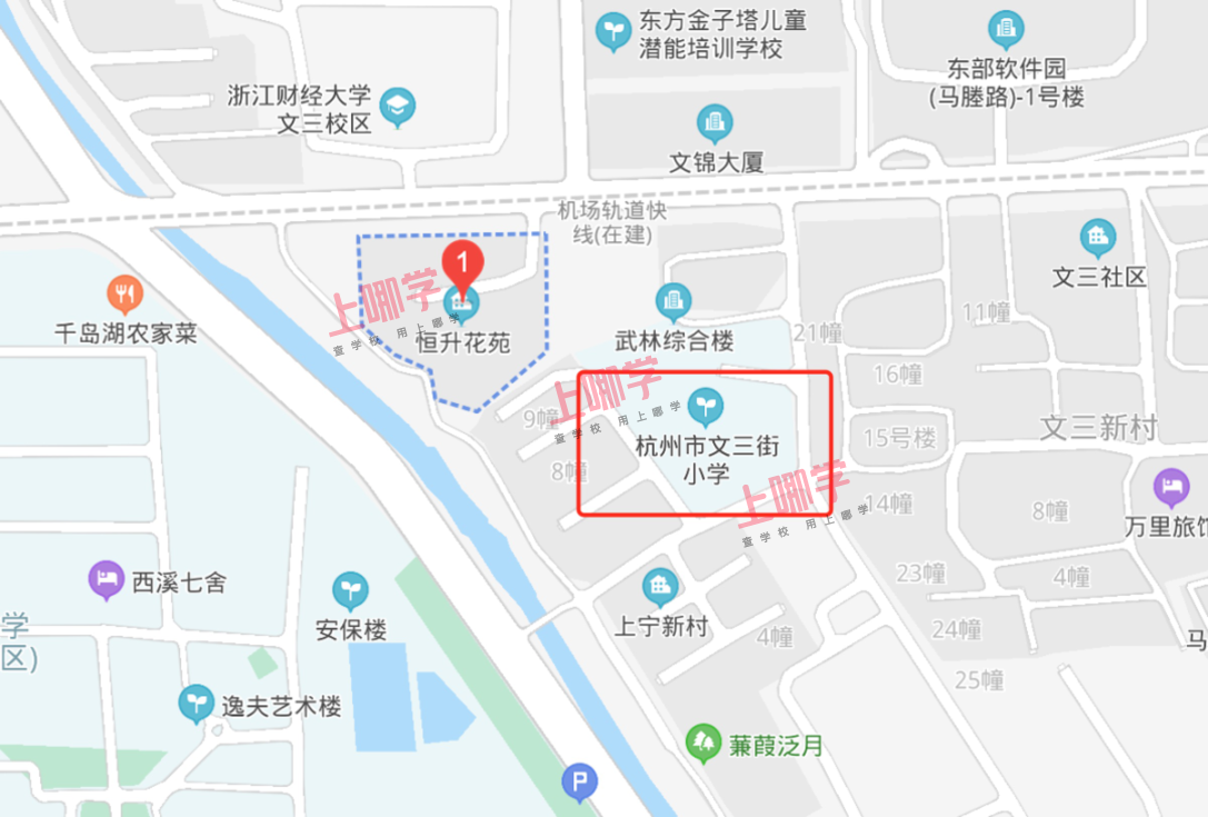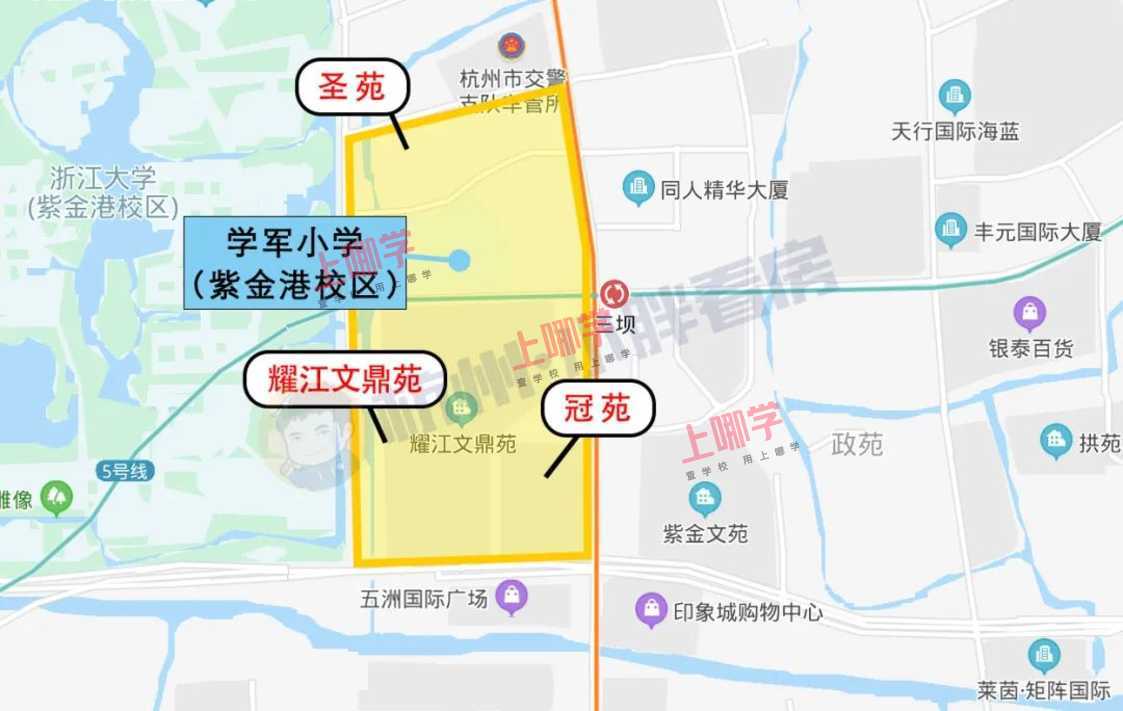 为学军小学三大分校之一,紫金港校区于2008年开办,占地面积64亩,办学硬件设施在杭州公办学校中属于前列,对口初中为紫金港中学(原保俶塔学校的初中部)。紫金港中学的学生中考水平属西湖区中等,往年排名7-8,但在往年的实际招生中,对口小学学军小学(紫金港)和文一街小学(政苑),两所学校拔尖生源多被民办初中摘走,2020年开始将实施公民同招政策,预计紫金港中学的整体水平可得到提高。(普中变优中指日可待)学军小学紫金港校区的学区总共才覆盖3个小区:耀江文鼎苑、冠苑、圣苑小区。后两者为省直机关房,三者中耀江文鼎苑体量最大,小区环境和楼盘品质都胜周边一筹。学军小学紫金港校区就在文鼎苑的北面一路之隔处,小区西面是浙江大学紫金港校区,小区居住群体不乏浙大年轻教师。