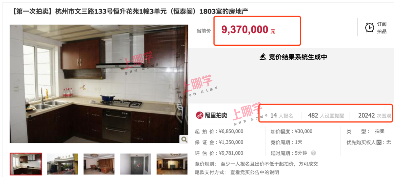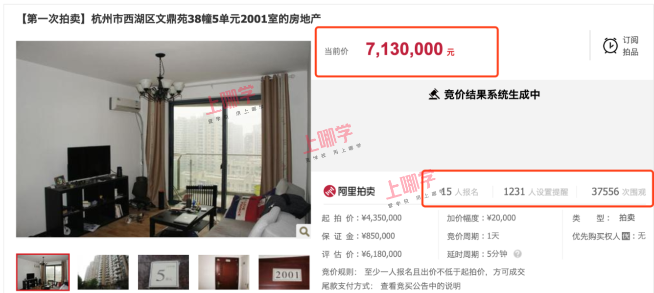 2号线三坝站地铁口就在边上,南面是五洲国际广场和印象城购物中心,同城西银泰城的直线距离也不过900米,可就近满足大型商超的购物所需。此前在法拍市场上出现的文鼎苑房源,多为大户型,总价动辄上千万,哪怕千万级,竞争依然十分激烈!实际上,低总价的小户型才是众多“学区刚需”的心头好。在二手房市场上,文鼎苑五六十方的小户型很吃香,成交单价甚至高达9、10万一个平方!毕竟五百来万的总价,不少“虎爸狼妈”还是能像买白菜一样接受的。但对于追求居住体验的家庭来说,五六十方的的小户型太拥挤,相较之下,87方的两室则舒适多了。本场法拍房源为杭州市西湖区文鼎苑38幢5单元2001室,户型建筑总面积87.02方,位于20层(总层高地面24层)。上图为笔者在二手网站找到的同面积户型,亮点主要是:高楼层,南北通透,餐客厅一体,带弧形阳台。法拍网站对这套房源的评估价为618万,其评估价格包含了室内固定装修。成交结果直接超出了评估价95万!据法拍网站上的信息公示,本套房源原业主为邱继宝和阮某某。