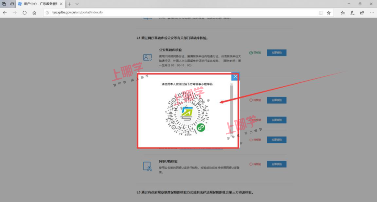 建议采用粤省事或微警认证微信扫一扫实名核验,点击核验,弹出二维码,家长用手机微信扫二维码,进行人脸识别认证。(必须儿童本人识别,人脸识别完成,就代表您账户已 等级四级(原L2)登记验证成功,可进行个人秒批事项申请)