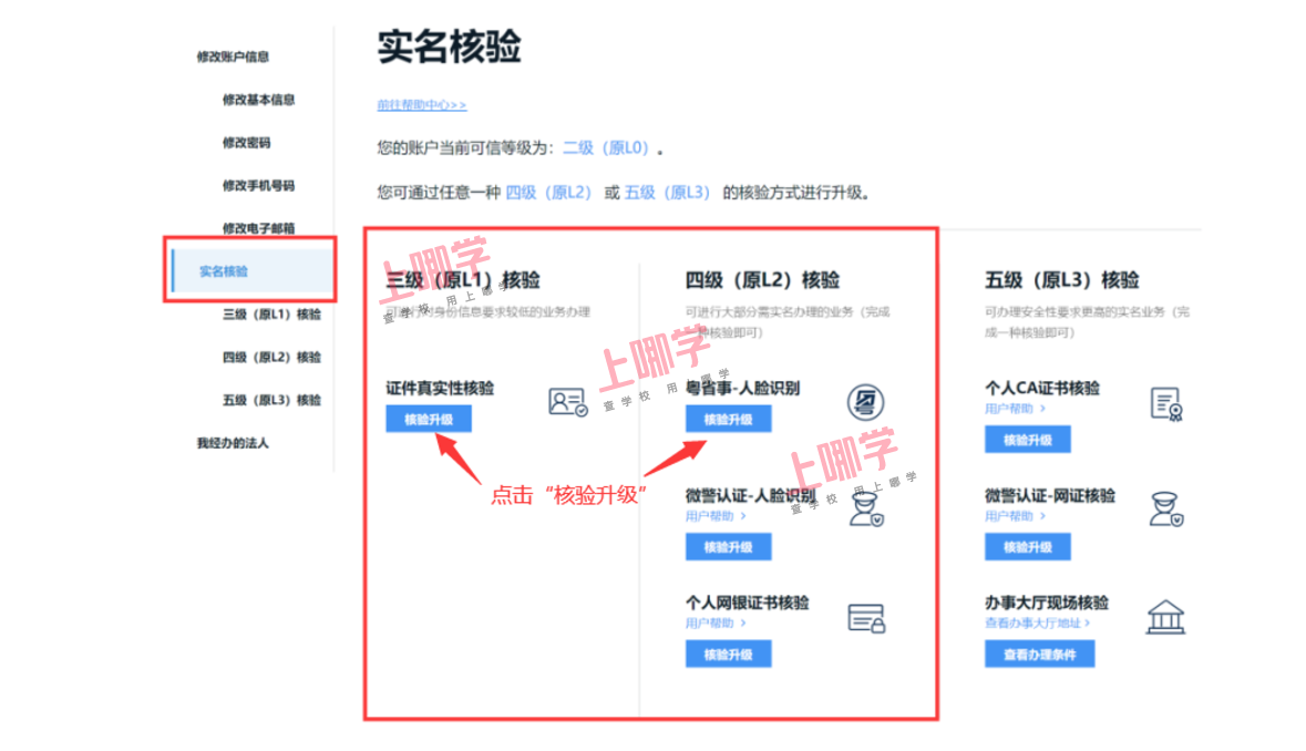 6、用户已经注册的账号登录,在右上角点击【登录账号名】,点击【账户管理】选择需要升级的等级和方式(建议升级到4级),点击【核验升级】完成账号等级升级。(PS:这一步有的区并不要求进行核验升级,家长可以根据情况跳过!直接滑到第7步)