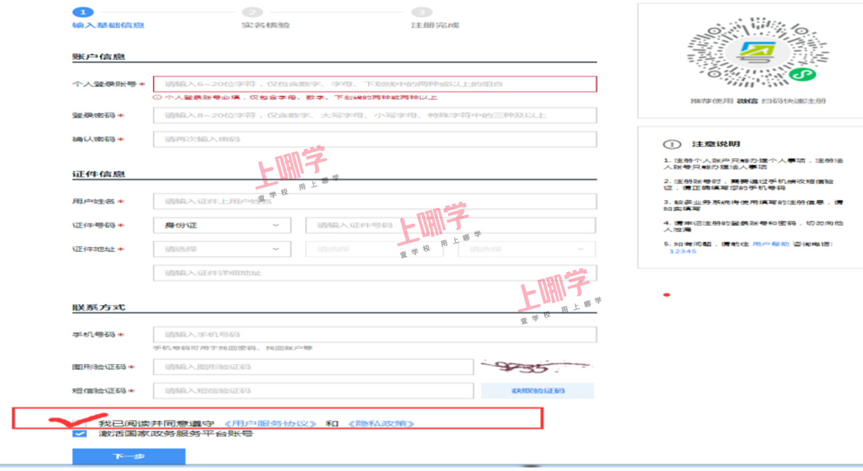 8、 申请人基本信息:填写完后,点击“我已阅读并同意遵守《服务协议》”进行下一步
