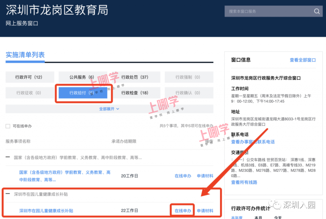 3、点击“行政给付”找到“深圳市在园儿童成长补贴”,点击“在线申办”