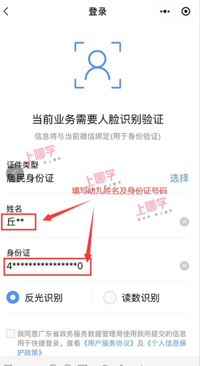 如果家长已在“粤省事”注册过个人账号,请先在“粤省事”个人中心中退出登录,然后扫二维码填写成幼儿姓名及身份号,进行幼儿的人脸识别