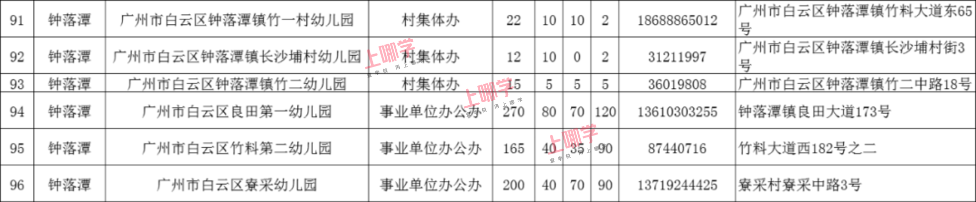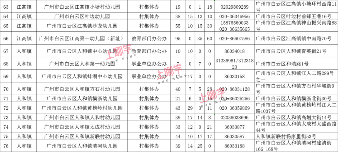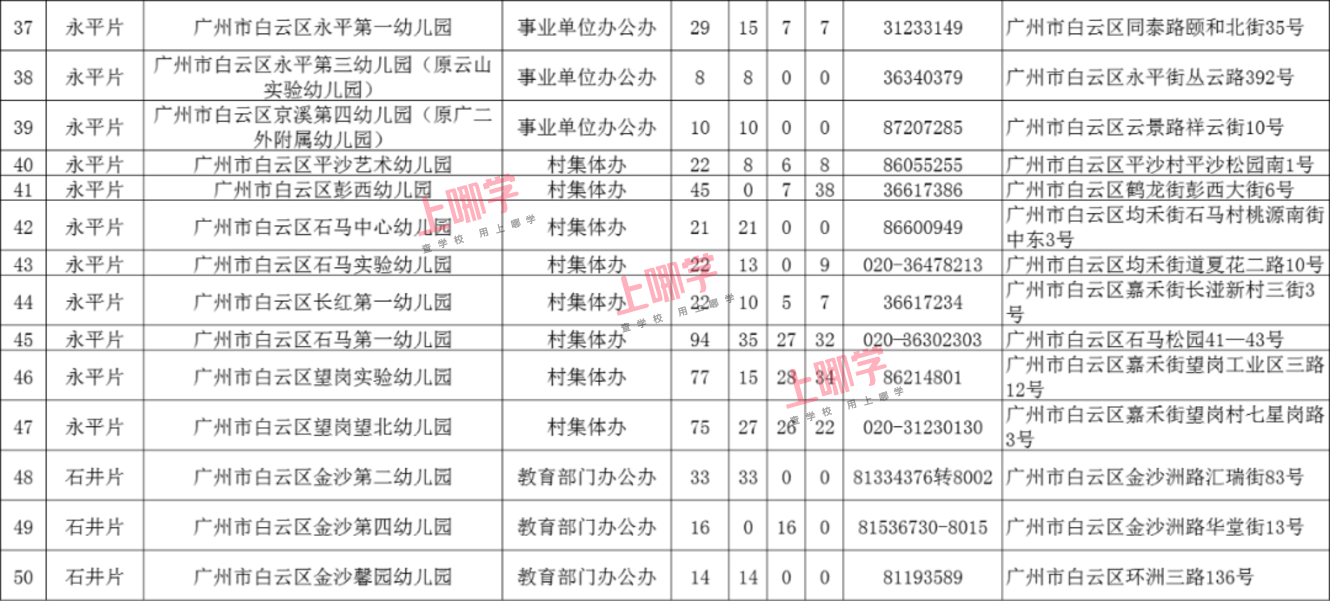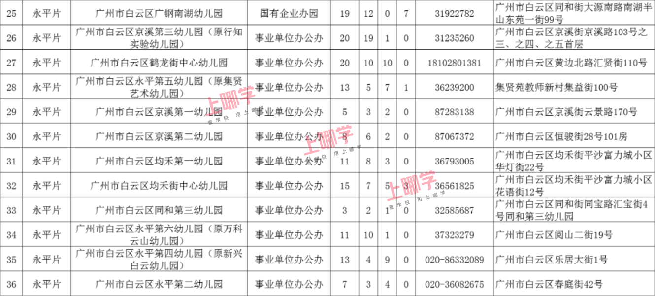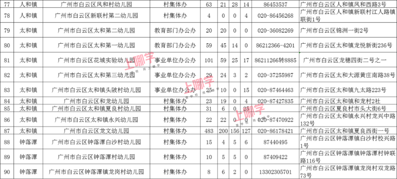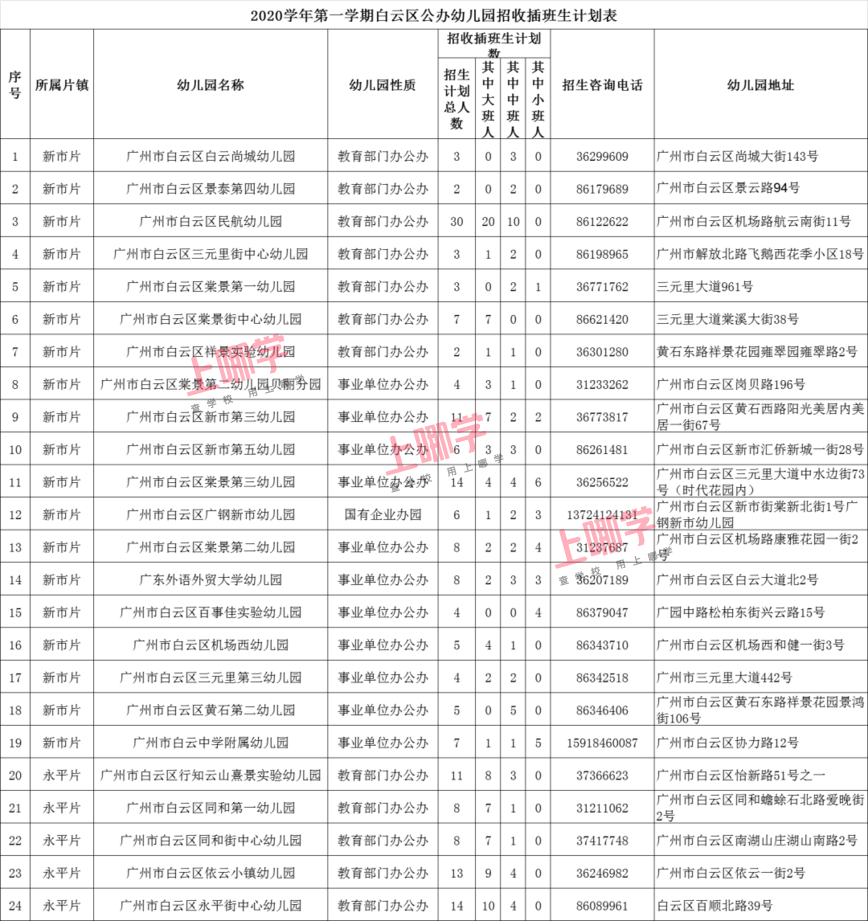 ▲2020年白云区公办幼儿园秋季插班生招生情况一览表