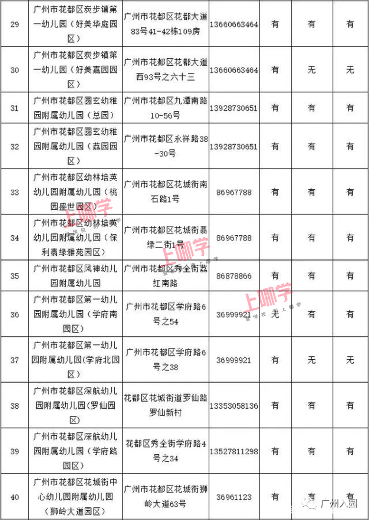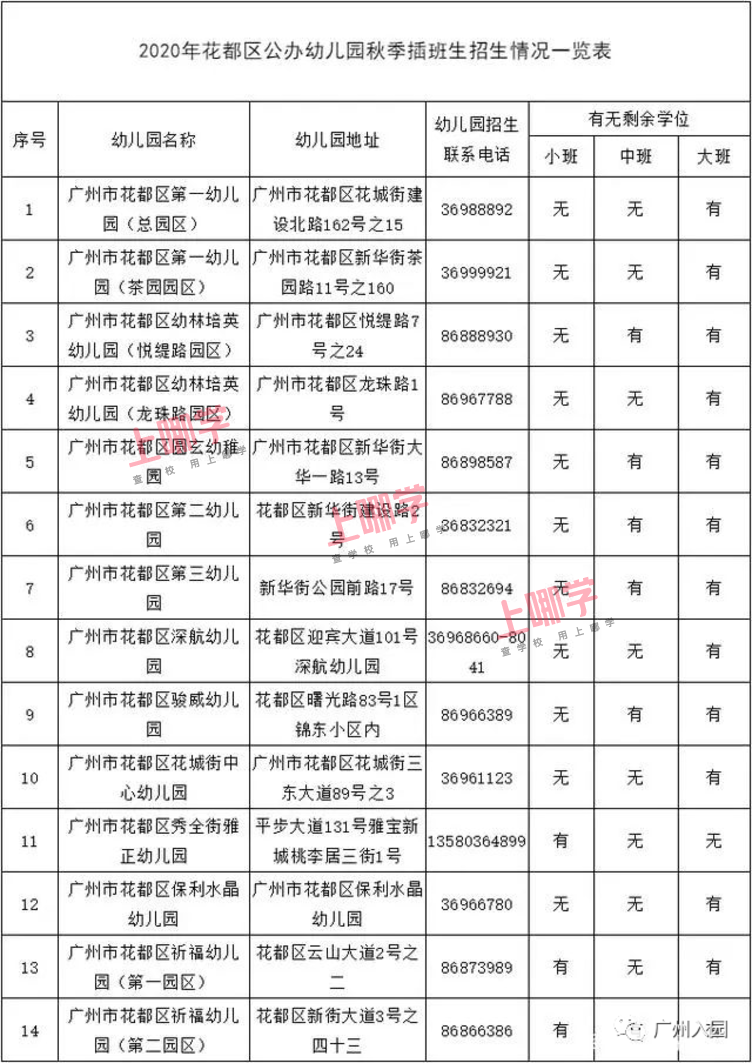 ▲2020年花都区公办幼儿园秋季插班生招生情况一览表