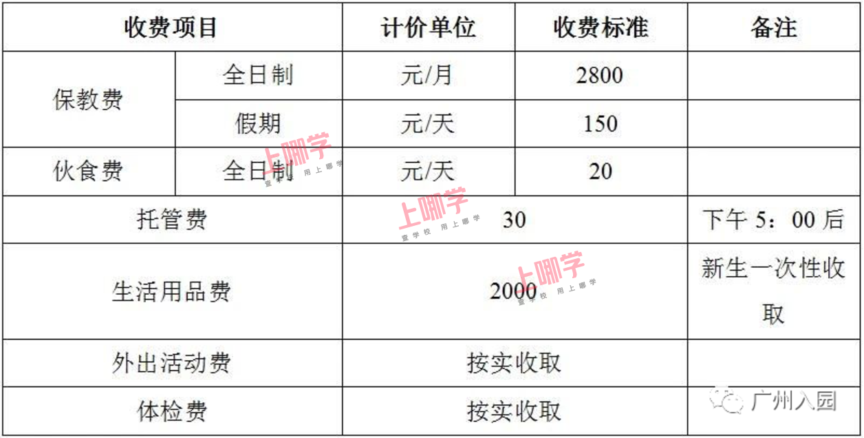●收费标准:广附精英班保教费3300元/月,伙食费500元/月(按学期收取)、广附朝阳班收费标准:保教费2300元/月,伙食费500元/月(按学期收取)