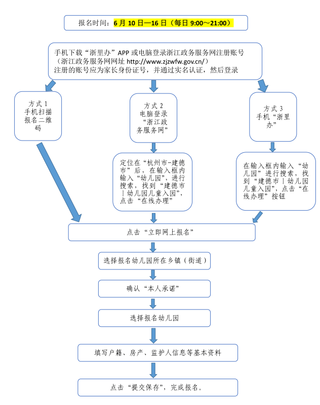 2.注册账号:2020年建德市幼儿园招生采用“网上报名”形式进行,需提前进入浙里办或浙江政务服务网注册账号(电脑端http://www.zjzwfw.gov.cn/),注册的账号应为家长身份证号,并通过实名认证,然后登录报名系统开始网上报名(操作流程如下图所示)。
