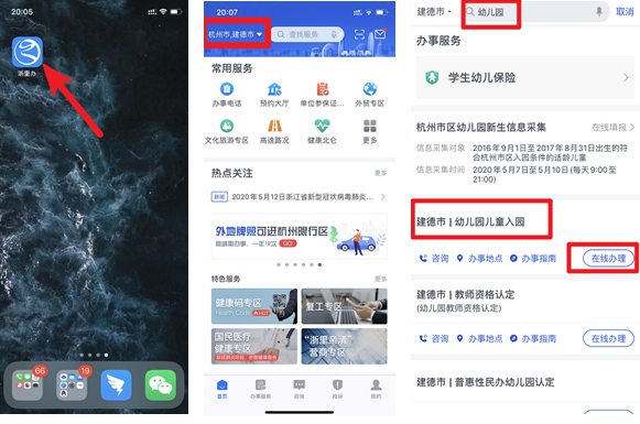 ③手机APP:登录“浙里办”APP,在输入框内输入“幼儿园”进行搜索,找到“建德市丨幼儿园儿童入园”,点击“在线办理”按钮进行报名。