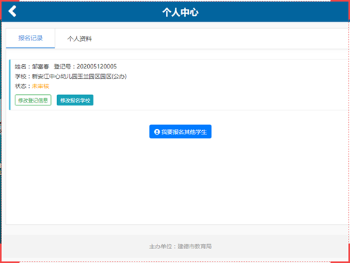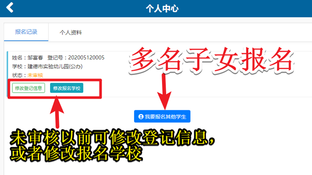 完成报名后,在预登记时间范围内,可点击“去个人中心”,点击个人中心页的“报名记录”模块,选择修改登记信息或修改报名幼儿园(一旦报名通过审批,状态变更为已审核,或者报名时间已截止,就无法再修改信息和更换报名幼儿园)。