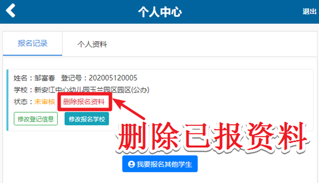 如果家长已经完成填报并保存提交,则需要到个人中心,对已经报名的记录进行报名资料删除,并重新开始填写基本信息。