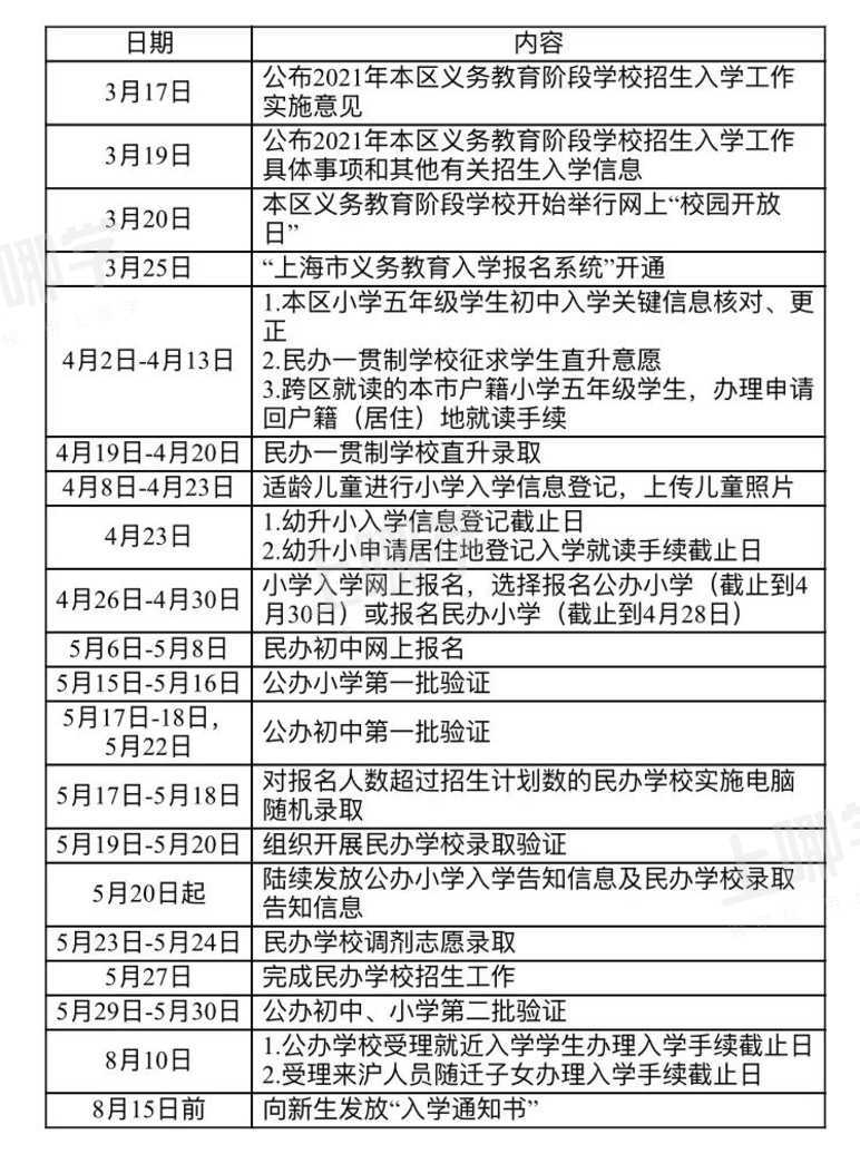 文章-【浦东新区】2021年|2021年浦东新区义务教育阶段学校招生入学工作日程安排