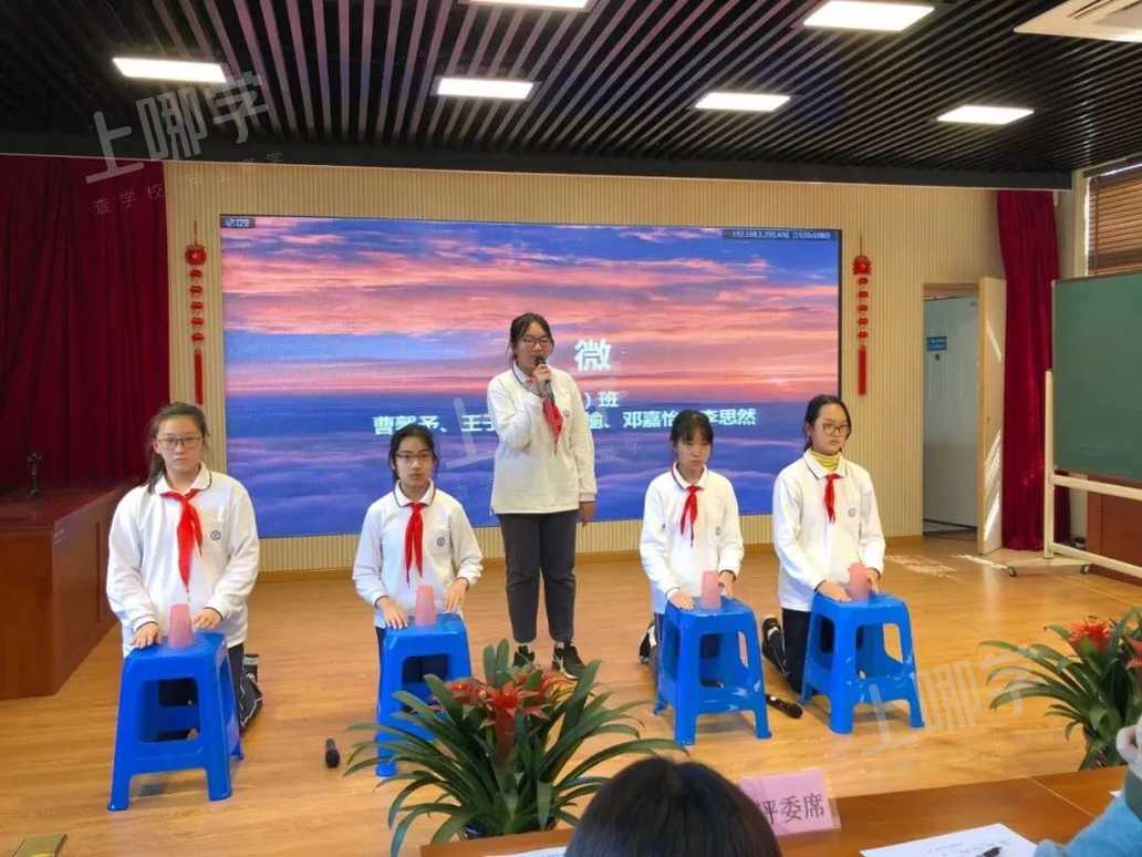 首先登场的是初二1班的同学,她们以小组的形式融合“杯子舞”演唱了歌曲《微微》,令大家印象深刻。