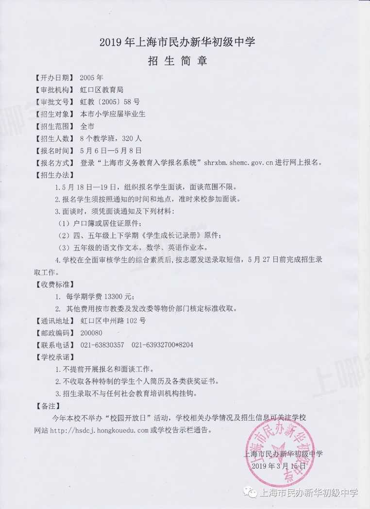 2019年上海市民办新华初级中学招生简章