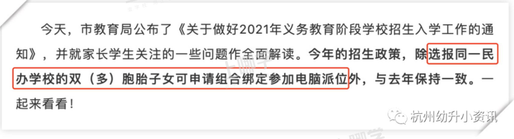 此外,杭州今年的招生政策明确规定:选报同一民办学校的双胞胎(多胞胎)子女家庭,可绑定参加电脑派位,如录取,将会追加计划。