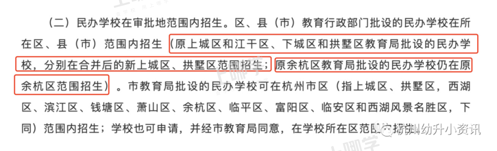 幼小君提醒: 杭州市区今年重新划分了行政区域,原上城区和原江干区和合并为新上城区,原下城区和拱墅区合并为新拱墅区,余杭区也重新进行了划分。 而根据今年的招生政策,今年民办小学招生时:原上城区和江干区、下城区和拱墅区教育局批设的民办学校,分别在合并后的新上城区、拱墅区范围招生;而原余杭区教育局批设的民办学校仍在原余杭区范围招生