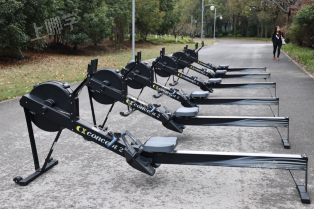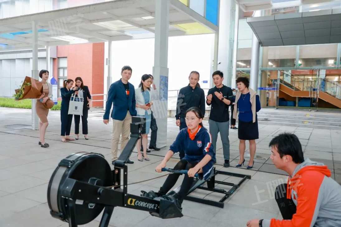 校园参观临近尾声,正值学校赛艇队的同学们正在训练,王石主席与正在进行划船机训练的同学们做了交流,同学们将赛艇队的队帽赠予了主席并合影留念。