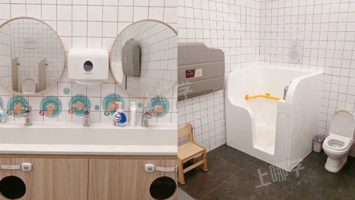 中心配有儿童独立卫生间,尿布台、淋浴、幼儿马桶和幼儿洗手台等。