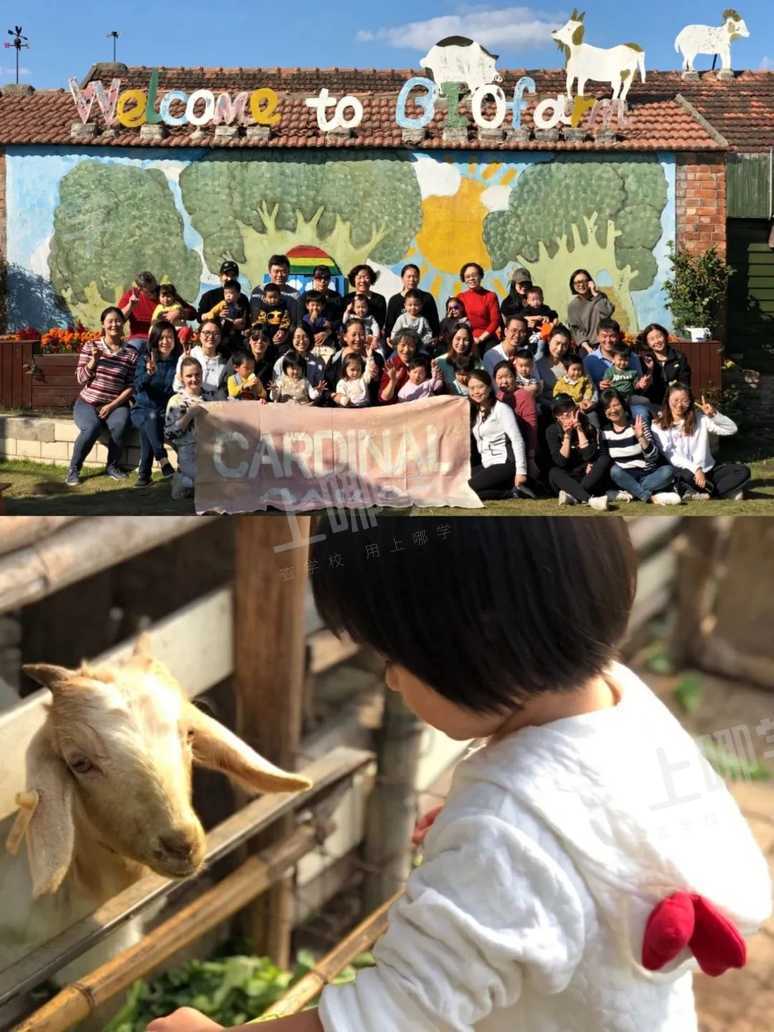 图为农场秋游活动的合照和小朋友与动物互动的照片,小朋友们通过亲身经历学习着有关动物的知识。