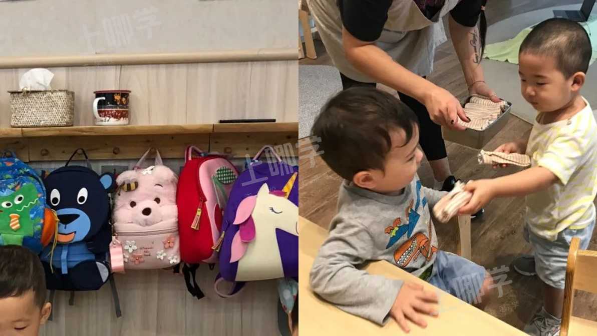 图为小朋友们的书包挂置区和发毛巾的日常,通过这些小事,小朋友们的养好习惯得到了养成。