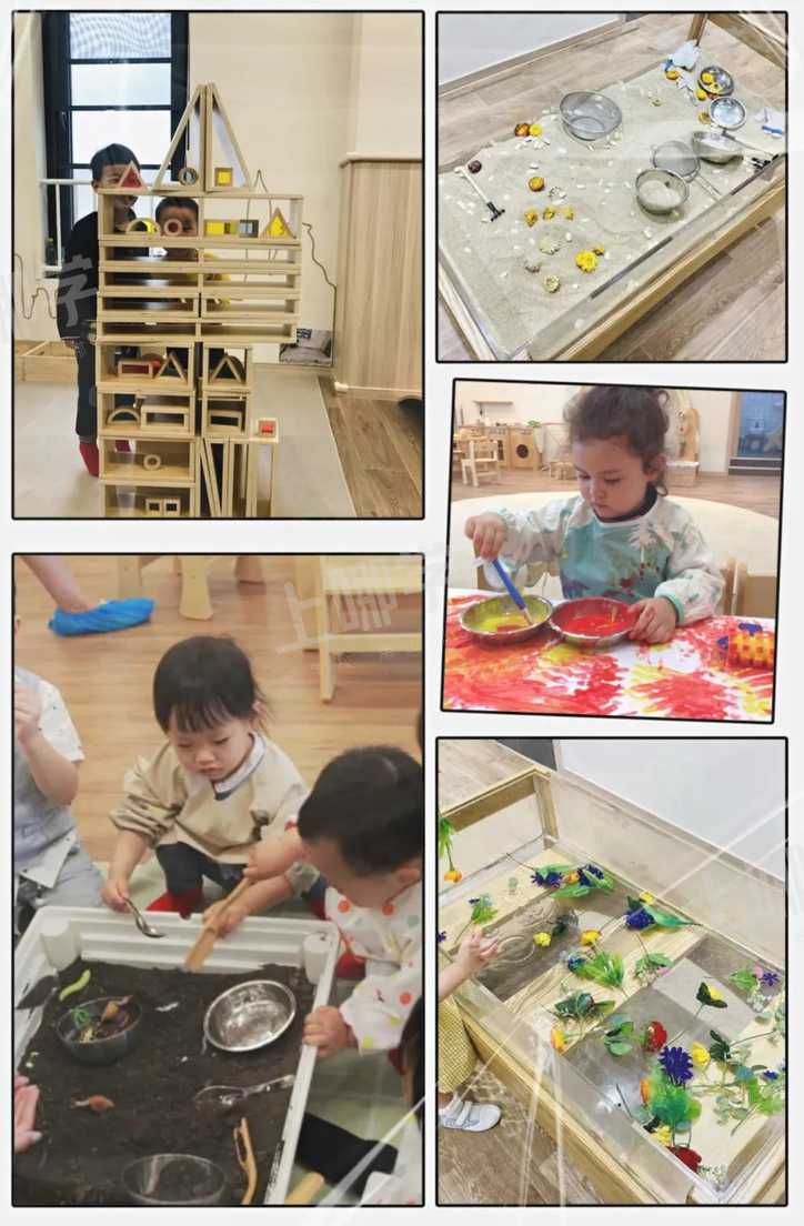图为五大开放式材料:水、沙、积木、粘土、颜料,小朋友们玩的不亦乐乎,动手能力和创造力提升了不少!
