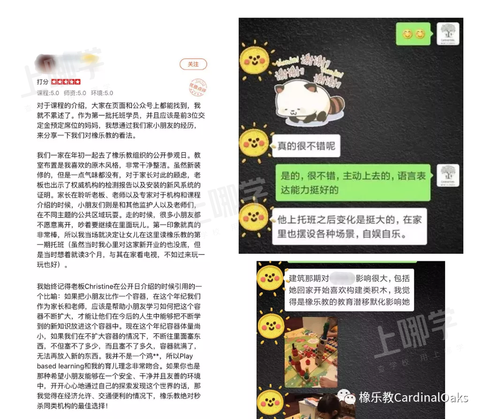 2019年3月,作为上海第一家以斯坦福Bing幼儿园PBL玩乐式引导学习为特色的幼儿教育中心,橡乐教在家长们的期待中拉开帷幕。现已过去了两年,橡乐教也顺利送走了一批批“毕业”的孩子。PBL双语托班里的一些孩子在橡乐教和家长的共同努力下,已不负众望的考入了德威、惠灵顿、耀中国际、中福会、维多利亚幼儿园……在这段时间里,他们或多或少超出预期的改变,让家长和橡乐教都感到非常欣慰、自豪!同时,家长们也不忘回以橡乐教积极的反馈。