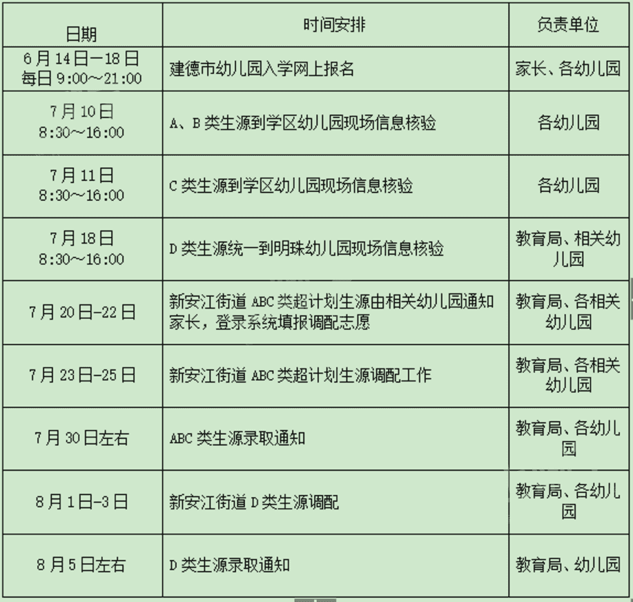 根据摸底情况,今年实验幼儿园、新安江中心幼儿园、明珠幼儿园等幼儿园户籍生已超常规招生计划数(具体见4月8日建德教育微信公众号发布的《新安江街道户籍儿童幼儿园小班入园温馨提示》)。 各类别(批次)超计划生源由市教育局统一汇总,并按照A→B→C类生源类别、批次、时间排序,根据排序位次,参照家长志愿在本街道或就近街道尚有招生余额的幼儿园统筹安排入园。 A、B类涉及调配的生源,如公办幼儿园余额调配已满或不愿意到被安排的公办或民办幼儿园就读,新生父母(监护人)可自行选择有余额的其他幼儿园就读。C、D类涉及调配的生源如不愿意到被安排的幼儿园就读,新生父母(监护人)可自行选择有余额的幼儿园就读或回户籍所在地就读。