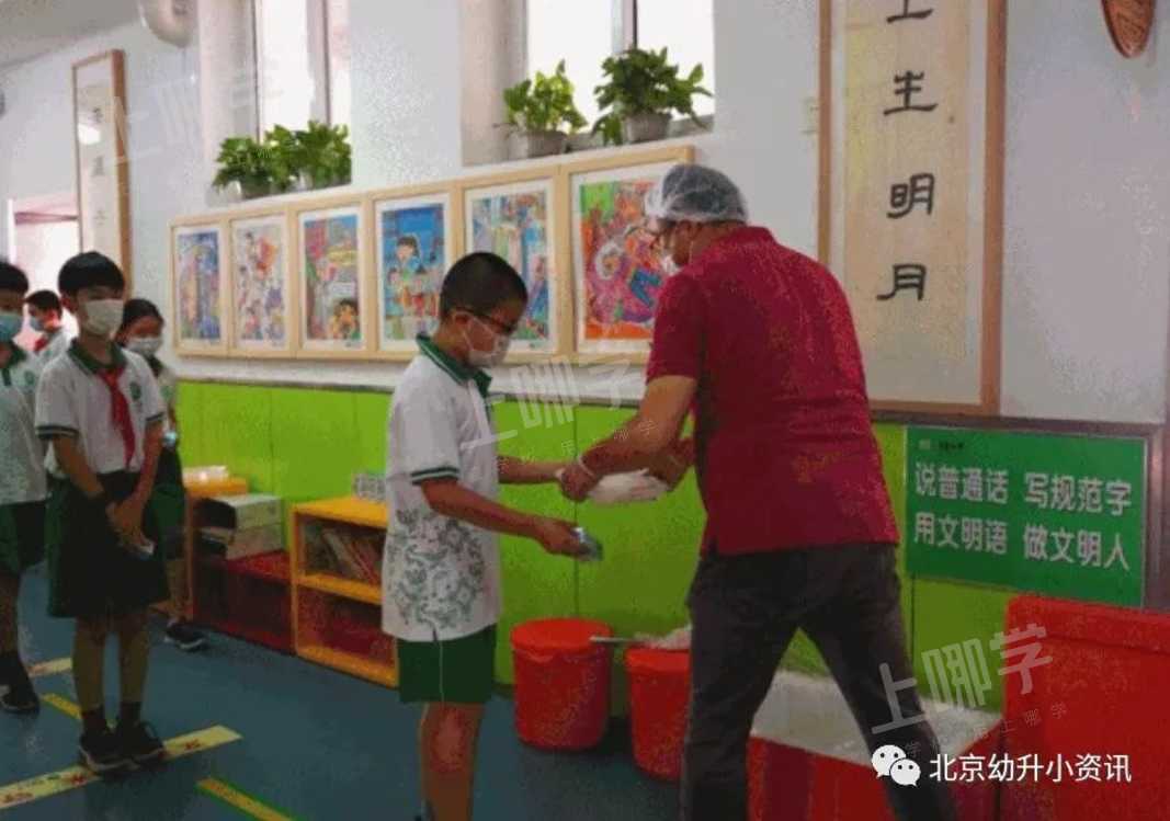 学校本部、东部、西部校区的孩子们都在教室里用餐,食堂的师傅会按时将午餐放到教室门口。