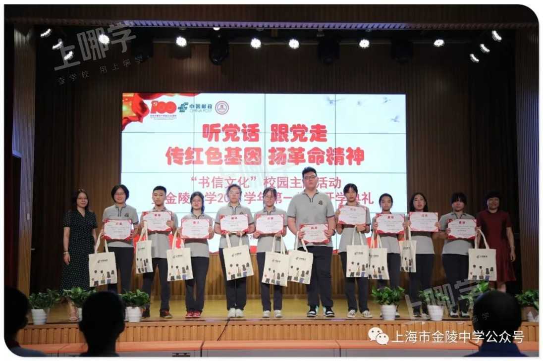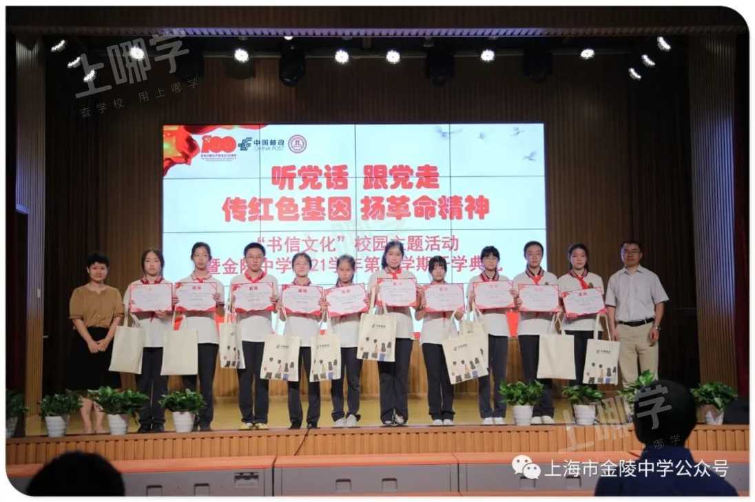 在上学期学校隆重举行的“奋斗百年路,启航新征程”主题教育活动中金陵中学退休教师施煜老师通过方寸邮票,与全校师生共同回眸伟大的中国共产党领导人民的百年奋斗历程,引起了金陵学子的极大反响。暑假期间,学校组织学生们从施老师介绍的邮票中挑选出自己感触最深的那枚,以小小邮票为载体,以书信的格式将对党的热爱之情融入只字片语中。学生们积极投稿,从中评选出20封优秀书信。来自中国邮政集团有限公司上海市黄浦区分公司的领导与金陵中学校领导共同为这20封书信的作者颁发奖状与奖品。