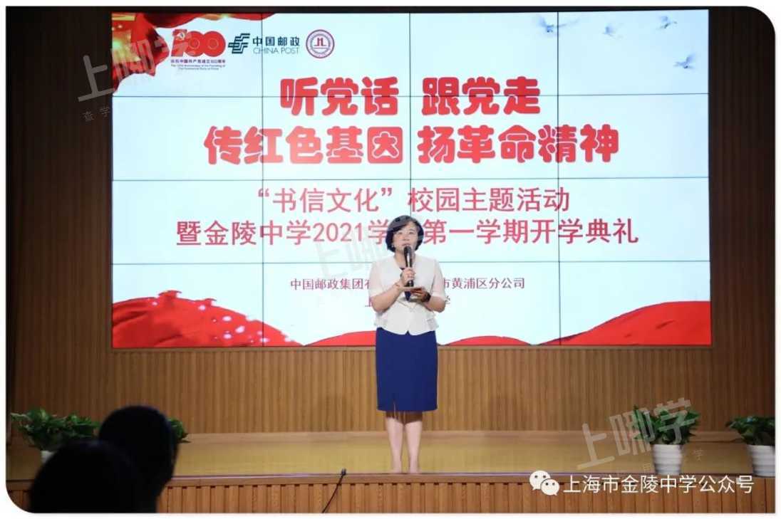 1972021年9月1日,金陵中学与中国邮政集团有限公司上海市黄浦区分公司携手在学校十一楼礼堂举行“听党话 跟党走 传红色基因 扬革命精神”——“书信文化”校园主题活动暨2021学年第一学期开学典礼。中国邮政集团有限公司上海市分公司团委书记、中国邮政集团有限公司上海市黄浦区分公司副总经理刘赟女士、中国邮政集团有限公司上海市黄浦区分公司集邮与文化传媒部经理莫丽女士、集邮与文化传媒部副经理罗海先生莅临现场,金陵中学全体师生共同参与。