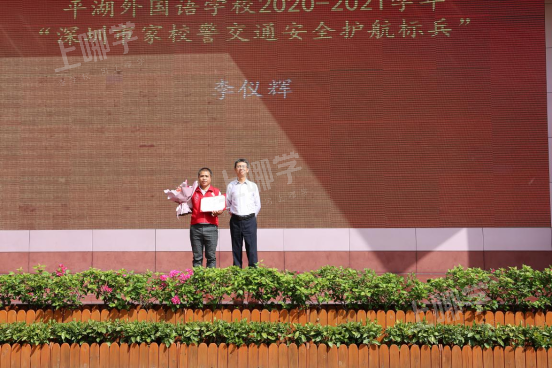 我校五年级(3)班的家长义工李仪辉同志一直热心参加家长义工队,每日站在最前沿的岗位护送学生上学,深受学生和家长好评,荣获“2020年深圳市‘家校警’交通安全护航标兵”荣誉称号,张伟校长为他颁奖。